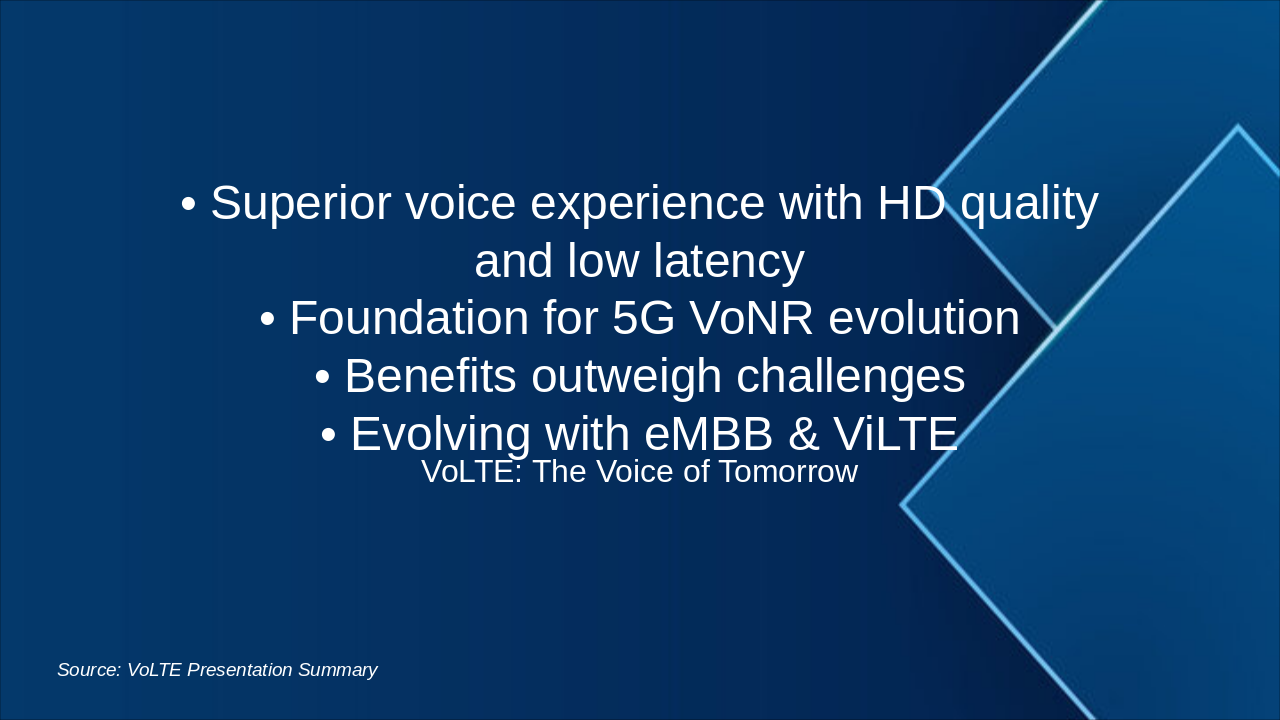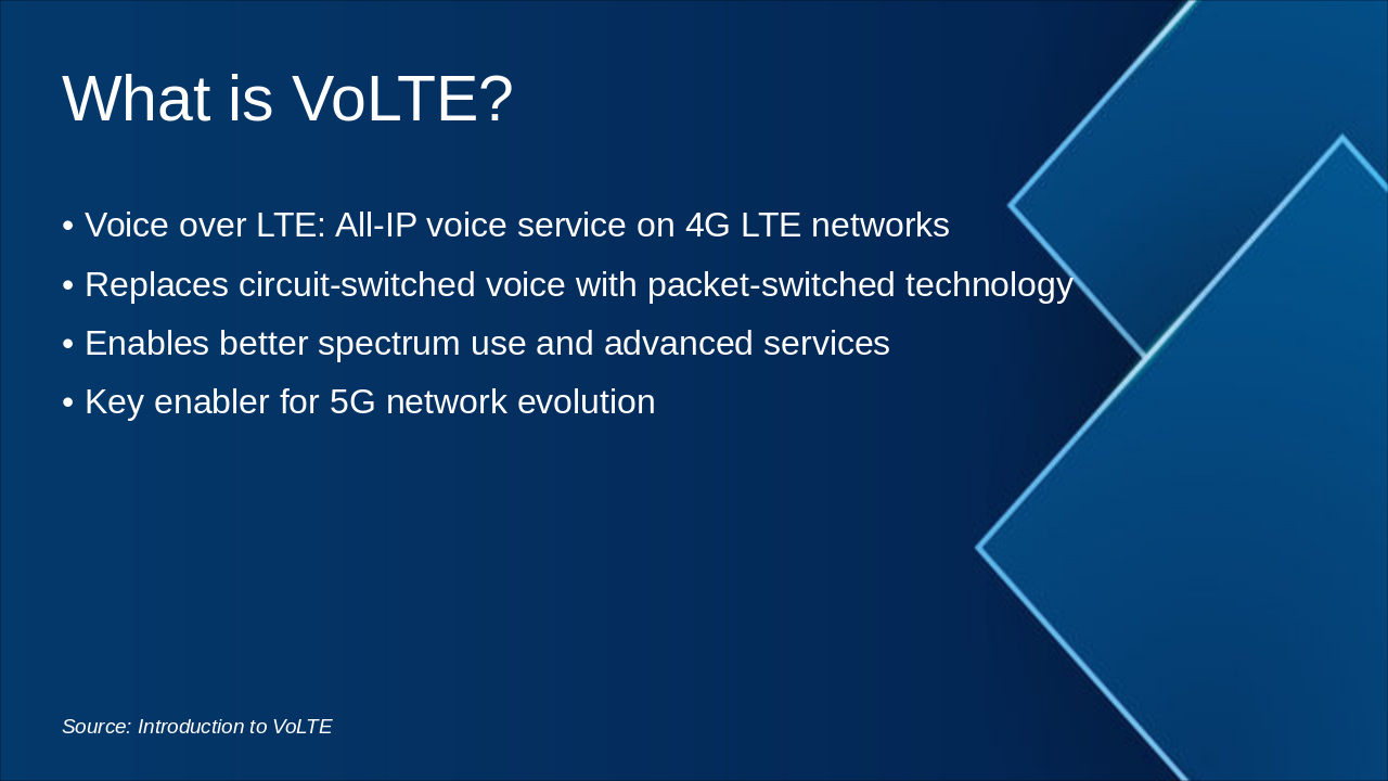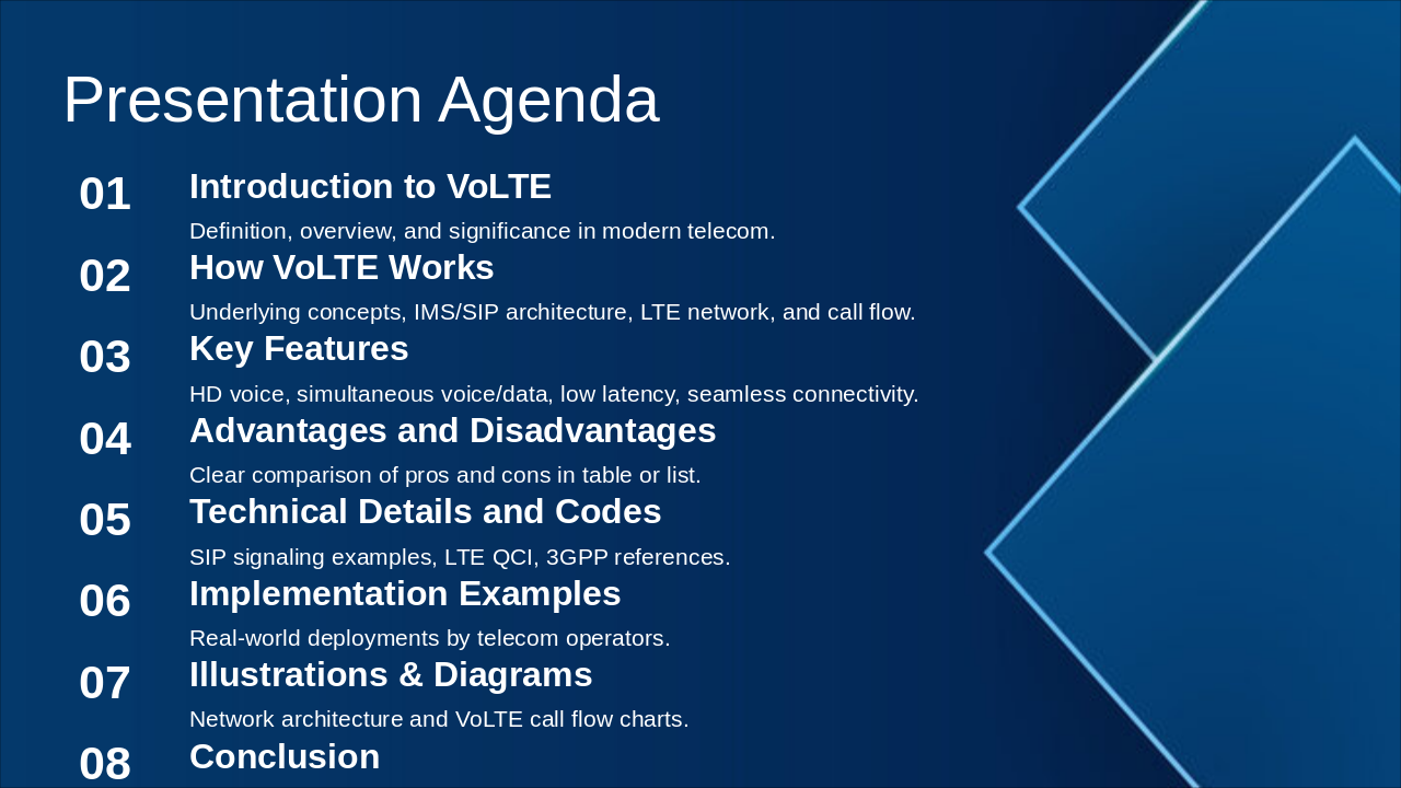 This agenda slide outlines a presentation on VoLTE, covering its introduction, workings via IMS/SIP and LTE, key features like HD voice, and pros/cons. It also includes technical details, real-world implementations, diagrams, and a concluding summary with future outlook.