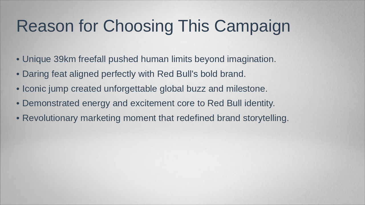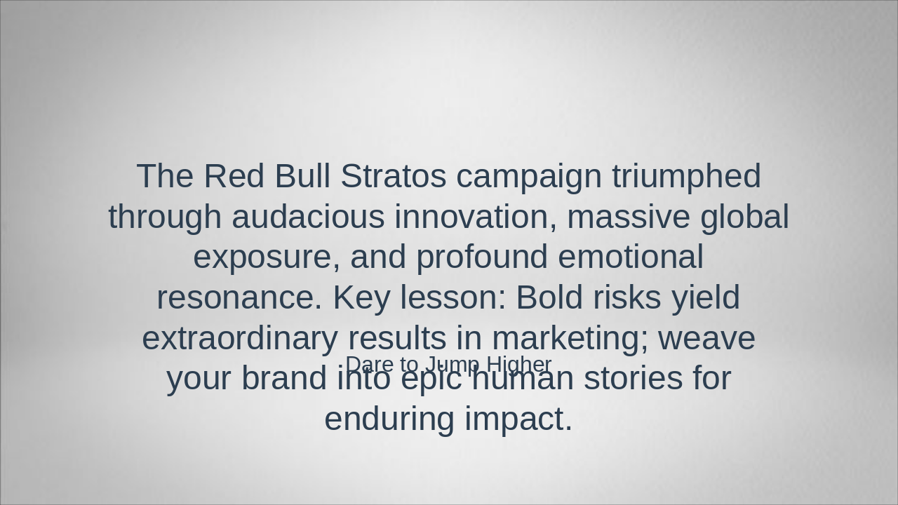 The slide introduces the Red Bull Stratos project, highlighting Felix Baumgartner's daring leap from the edge of space. It focuses on his iconic jump on October 14, 2012, with a subtitle emphasizing the historic event.