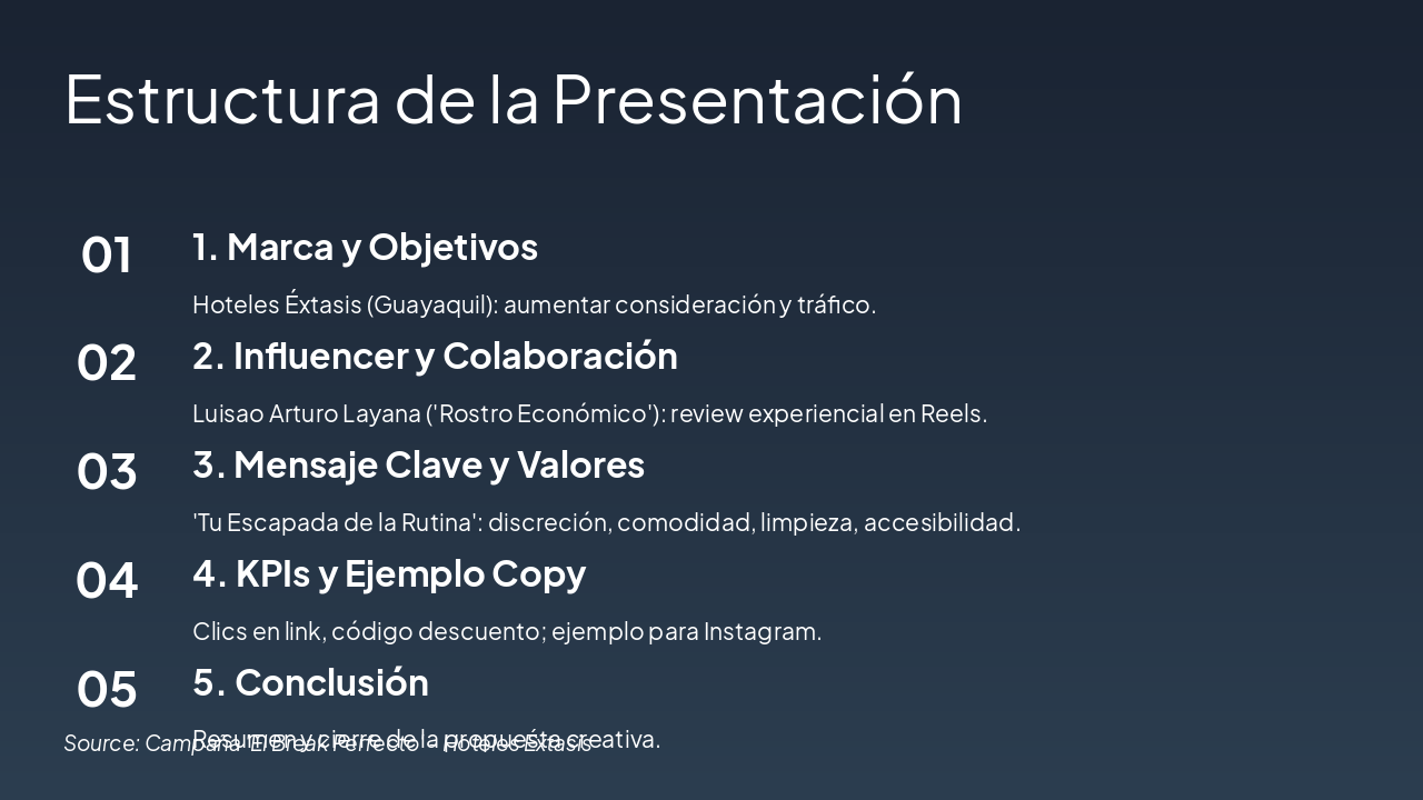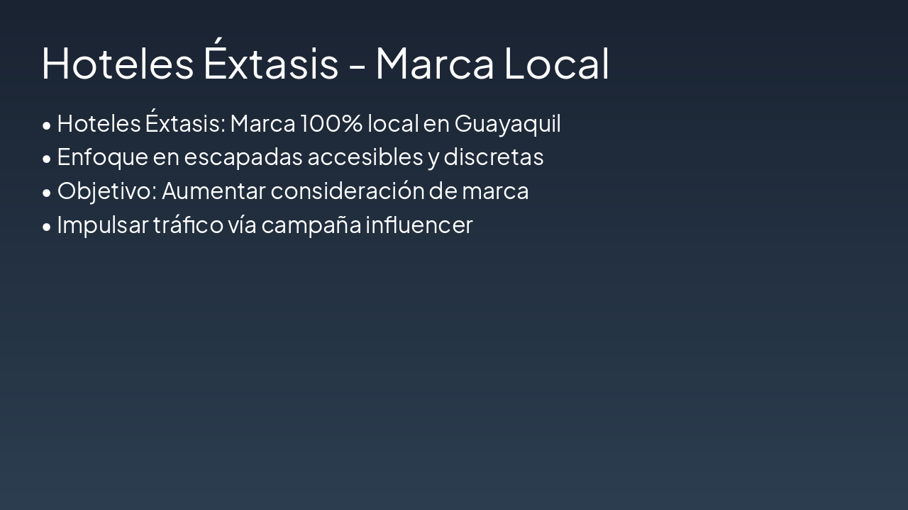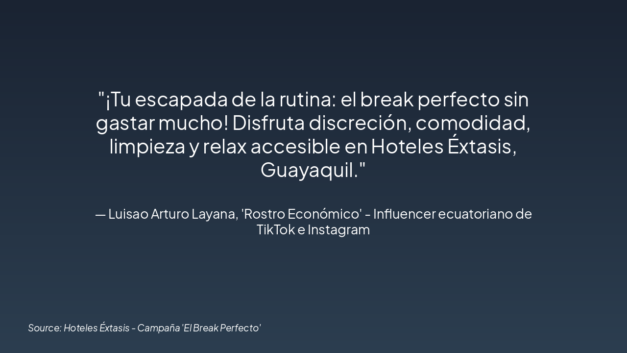 The slide's key message quote promotes Hoteles Éxtasis in Guayaquil as an affordable escape from routine, highlighting discretion, comfort, cleanliness, and accessible relaxation. It is attributed to Ecuadorian influencer Luisao Arturo Layana, known as "Rostro Económico" on TikTok and Instagram.