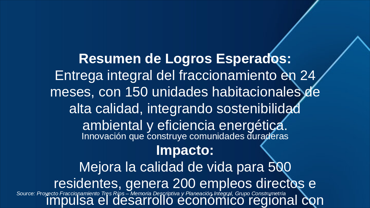 **Resumen de Logros Esperados: Entrega integral del fraccionamiento en 24 meses, con 150 unidades habitacionales de alta calidad, integrando sostenibilidad ambiental y eficiencia energética.