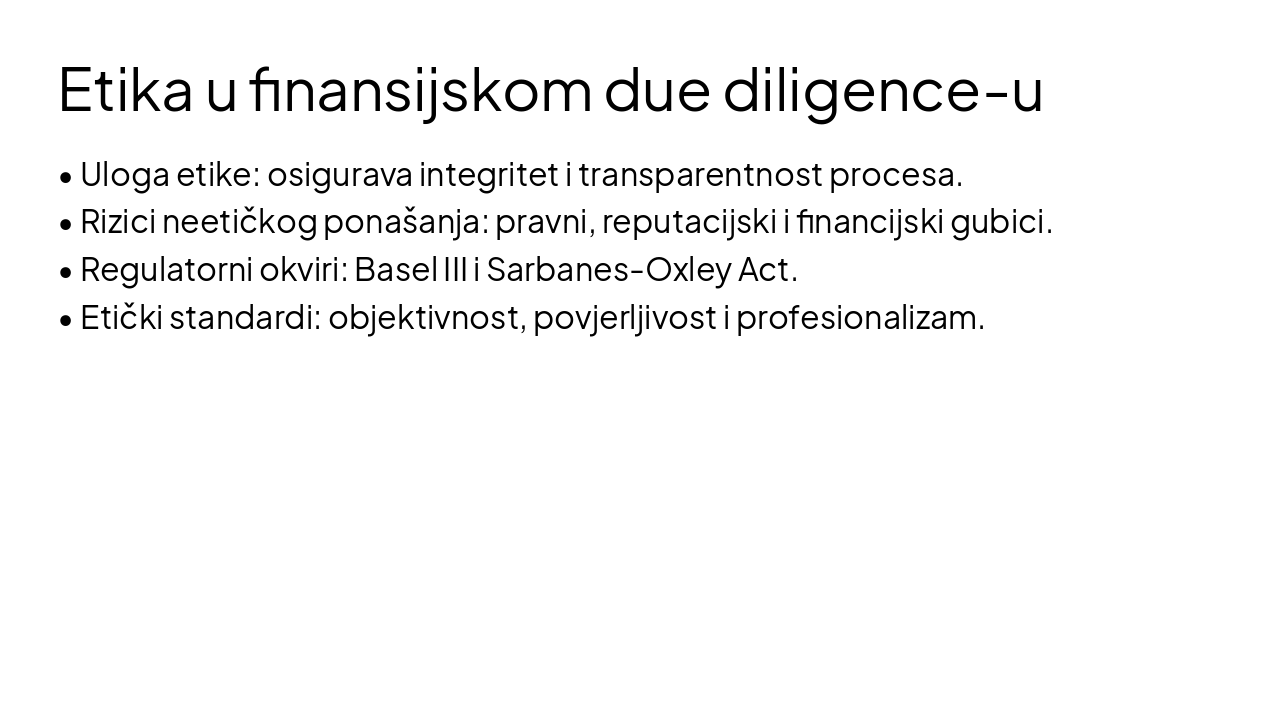Izradi PowerPoint prezentaciju na osnovu seminarskog rada Dženete Hamzić na temu 'Etika i odgovornost u sprovođenju finansijskog due diligence-a'. Prezentacija treba imati moderan minimalistički stil sa svijetlom pozadinom i crnim tekstom. Uključi sljedeće slajdove: 1. Naslovni slajd: UNIVERZITET FINRA TUZLA, Seminarski rad iz predmeta Etika i odgovornost u sprovođenju finansijskog due diligence-a, Student: Dženeta Hamzić, Mentor: (prazno polje) 2. Uvod 3. Teorijski okvir finansijskog due diligence-a 4. Ciljevi i funkcije finansijskog due diligence-a 5. Vrste due diligence-a 6. Metodologija i faze finansijskog due diligence-a 7. Etika u finansijskom due diligence-u 8. Etički principi u finansijskom due diligence-u 9. Etičke dileme i profesionalni standardi 10. Zaključak 11. Kraj pitanja — Hvala na pažnji!