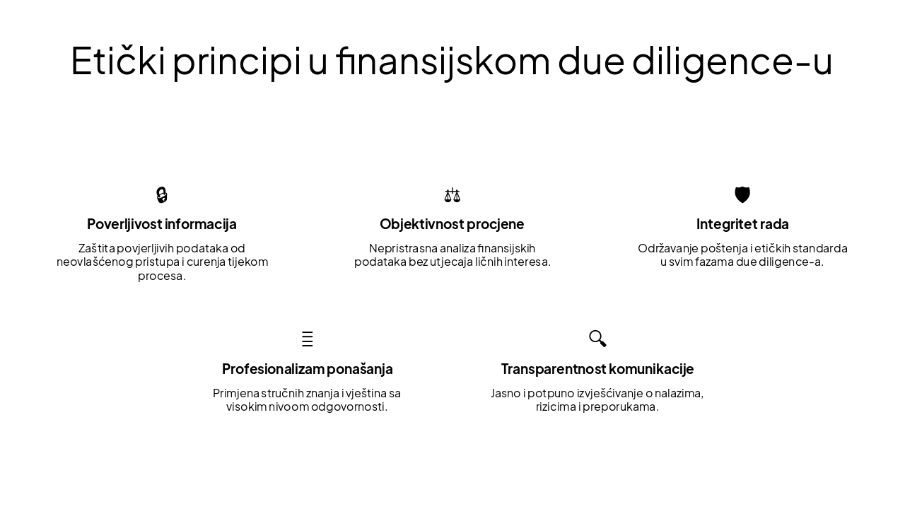 { "features": [ { "icon": "🔒", "heading": "Poverljivost informacija", "description": "Zaštita povjerljivih podataka od neovlašćenog pristupa i curenja tijekom procesa." }, { "icon": "⚖️", "heading": "Objektivnost procjene", "description": "Nepristrasna analiza finansijskih podataka bez utjecaja ličnih interesa." }, { "icon": "🛡️", "heading": "Integritet rada", "description": "Održavanje poštenja i etičkih standarda u svim fazama due diligence-a." }, { "icon": "💼", "heading": "Profesionalizam ponašanja", "description": "Primjena stručnih znanja i vještina sa visokim nivoom odgovornosti." }, { "icon": "🔍", "heading": "Transparentnost komunikacije", "description": "Jasno i potpuno izvješćivanje o nalazima, rizicima i preporukama." } ] }