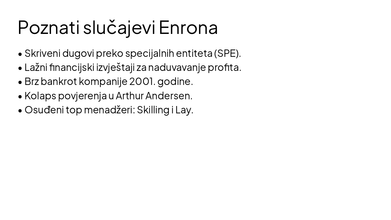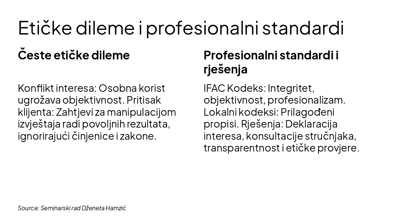 | Konflikt interesa: Osobna korist ugrožava objektivnost. Pritisak klijenta: Zahtjevi za manipulacijom izvještaja radi povoljnih rezultata, ignorirajući činjenice i zakone. | IFAC Kodeks: Integritet, objektivnost, profesionalizam. Lokalni kodeksi: Prilagođeni propisi. Rješenja: Deklaracija interesa, konsultacije stručnjaka, transparentnost i etičke provjere. |