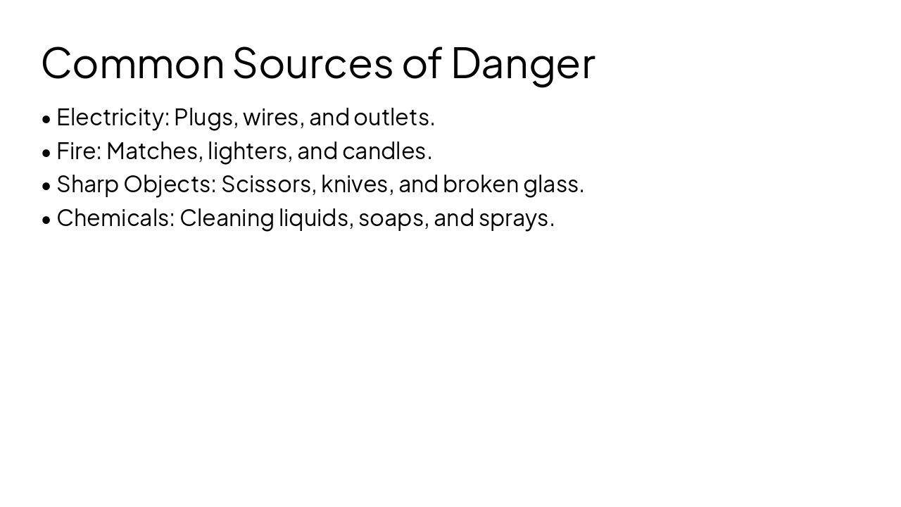 Create a PowerPoint presentation for Grade 3 students in Jordan about the science lesson "Dangers Around Us and Sources of Danger". The presentation should be simple, colorful, and suitable for young children. Use clear and easy English language. Include the following slides: Title slide (Lesson name + attractive image idea) Introduction: What are dangers around us? Types of dangers (at home, at school, in the street) Sources of danger (electricity, fire, sharp objects, chemicals, traffic) Examples of each type with simple explanations How to stay safe (basic safety rules for kids) Interactive questions for students (2–3 simple questions) Conclusion (short summary) Make each slide short with bullet points (max 3–4 points per slide). Add suggestions for images or icons for each slide. Make the tone fun and engaging for children.