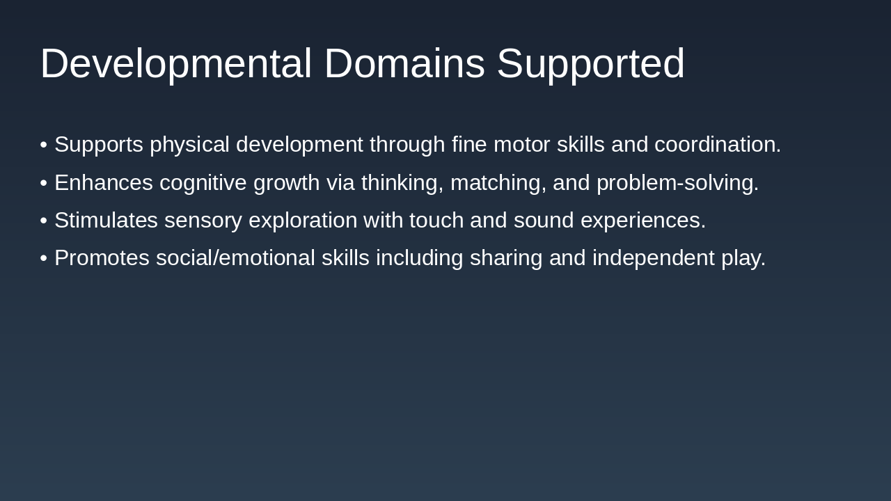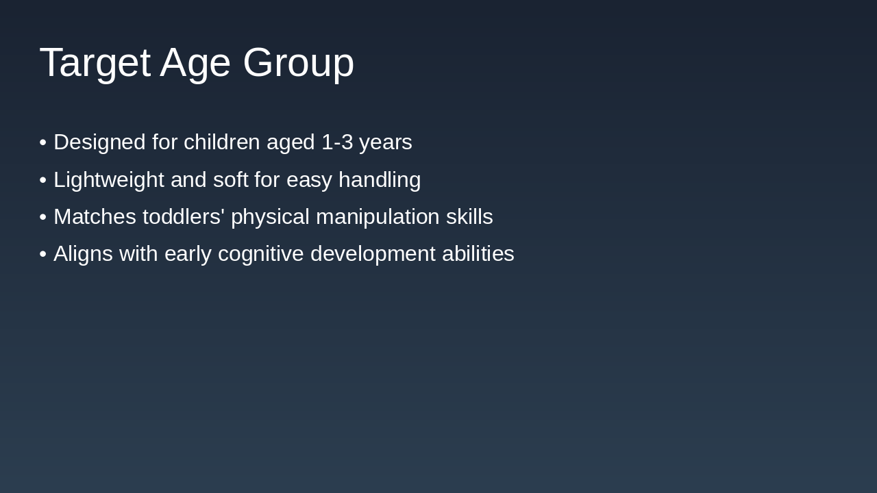 Safe, simple toy for 1-3 years. Supports physical, cognitive, sensory, social development. Promotes fun, engaging, age-appropriate learning through play.