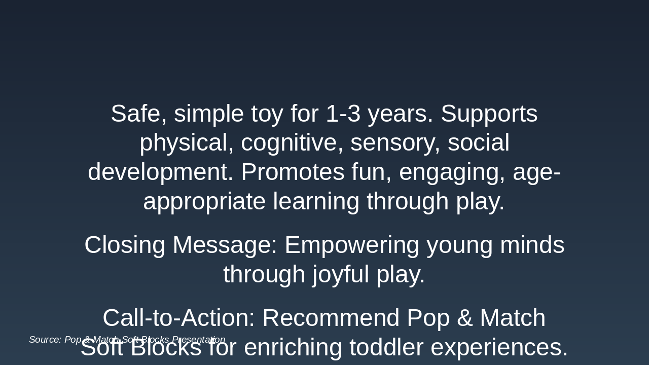 The conclusion slide highlights the Pop & Match Soft Blocks as a safe, simple toy ideal for children aged 1-3, supporting physical, cognitive, sensory, and social development while promoting fun, engaging, and age-appropriate learning through play. It closes with the message "Empowering young minds through joyful play" and a call-to-action to recommend the toy for enriching toddler experiences.