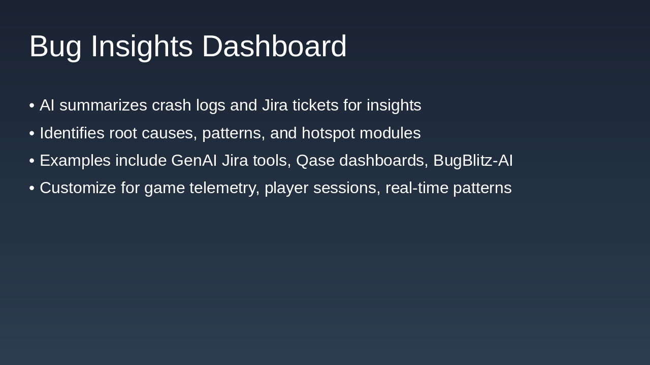 • Bug Insights Dashboard: AI summarization of crash logs and Jira tickets for managerial overview.