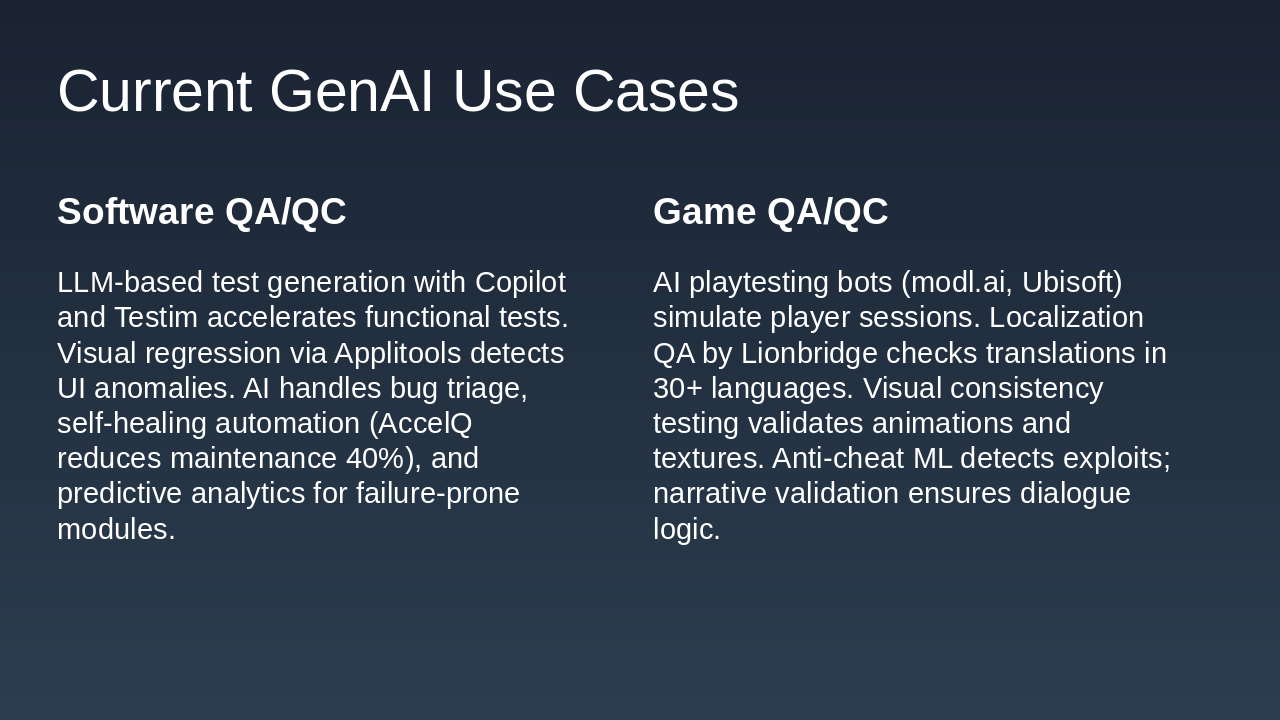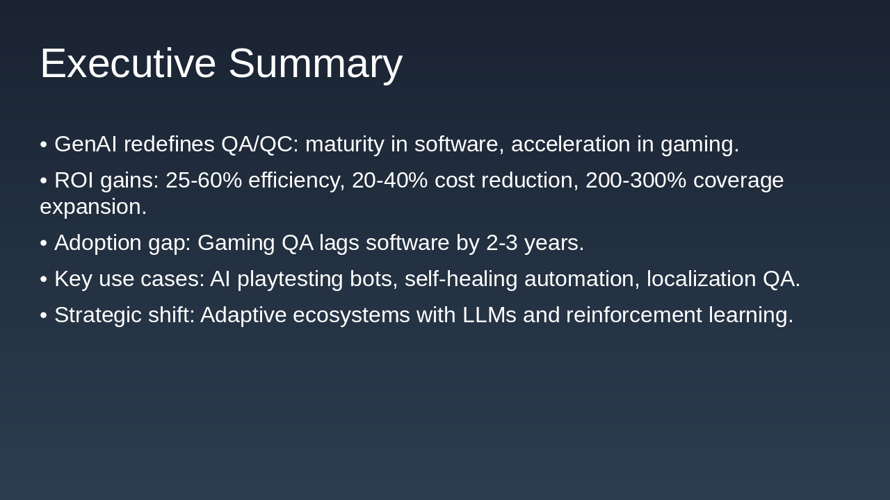 Key Takeaways: - ROI: 25–60% efficiency gains, 20–40% cost reduction, and up to 200–300% test coverage expansion. - Adoption Gap: Game QA lags 2–3 years behind software QA but is rapidly catching up. - Top Use Cases: AI playtesting bots, natural language test generation, visual regression, self-healing automation, localization QA, and telemetry-based bug detection. - Strategic Shift: From rule-based testing to intelligent, adaptive QA ecosystems integrating LLMs, reinforcement learning agents, and predictive analytics.