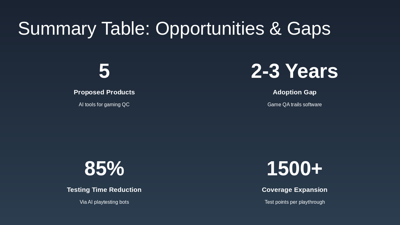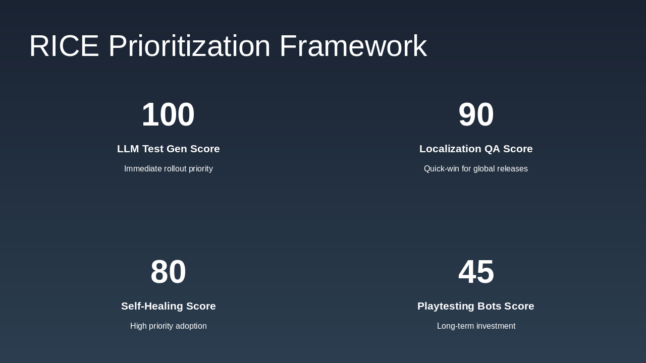 • Long term (>24 months): Invest in Procedural Stress Testing Agent for sandbox/open-world titles—highest impact but highest complexity.