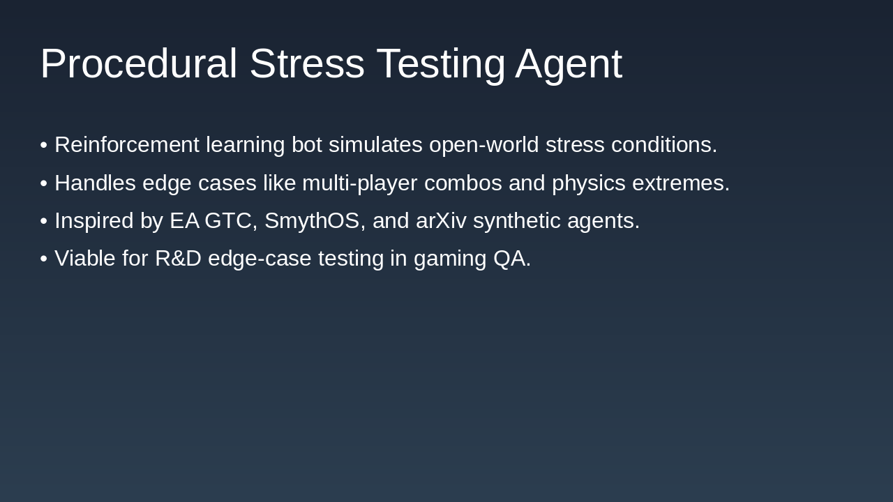 • Procedural Stress Testing Agent: Reinforcement learning-based bot for open-world and sandbox stress testing.