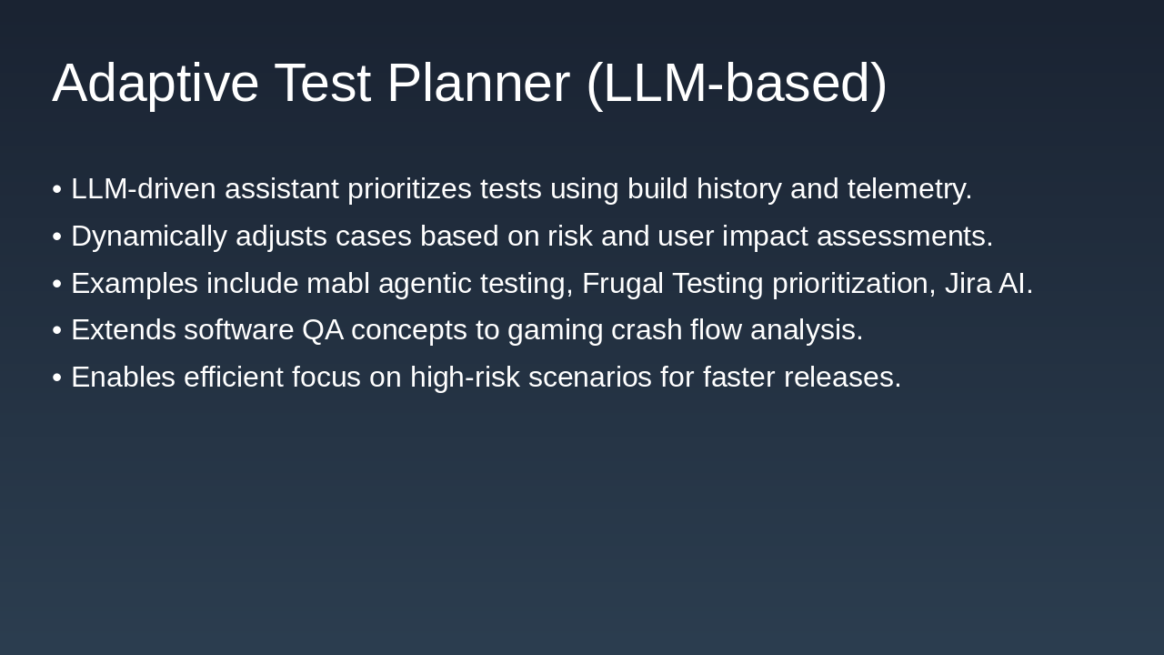 Key takeaway: While most examples are from software (web/app) QA, the concept of “adaptive test planning” is established and can be extended into gaming QA (e.g., prioritize game test flows after telemetry of crashes).