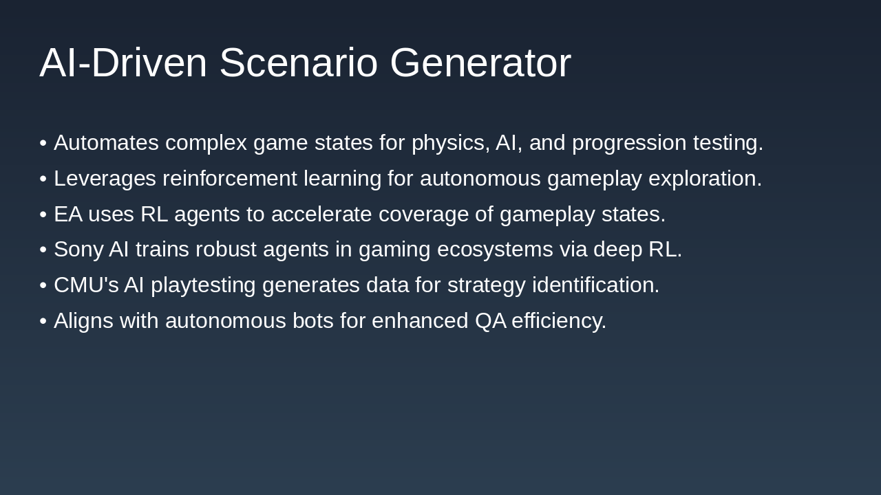 AI-driven Scenario Generator EA playtesting bots, Sony AI agents Expand to full game states (physics + progression) and integrate into QA pipeline.
