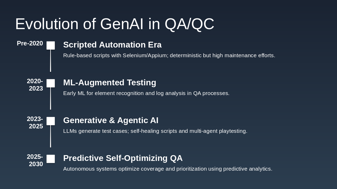 2025–2030 (Forecast) Predictive & Self-Optimizing QA Context-aware, autonomous QA systems optimizing coverage and prioritization.
