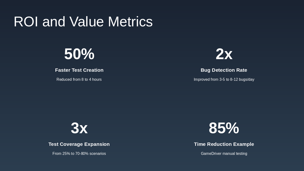 Strategic ROI Example: GameDriver’s Unity/Unreal integrations reduced manual testing time by 85% and improved validation coverage by 1500+ test points per playthrough.