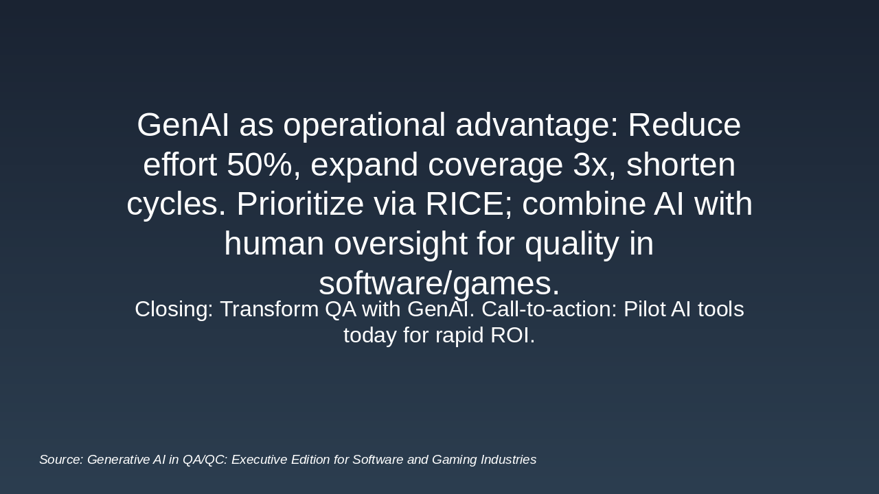 Generative AI is not merely a trend — it’s an operational advantage. Software QA shows measurable success, and game QA is on the cusp of transformation. By strategically prioritizing AI initiatives using the RICE framework, QC teams can: - Reduce test effort by up to 50%. - Expand coverage 3×. - Shorten release cycles while improving product quality.
