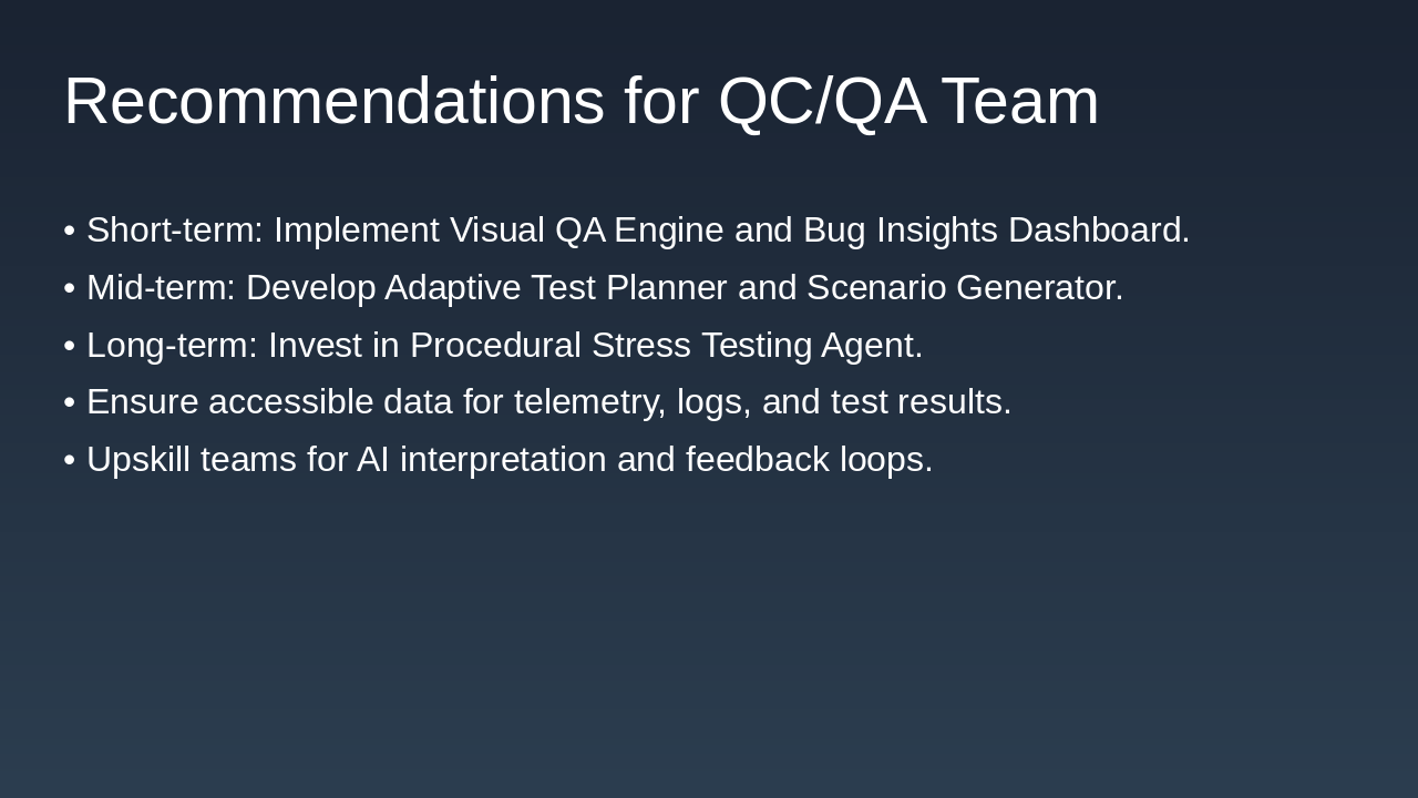 • Short term (6–12 months): Focus on the easier wins: Visual QA Engine (because tools/tech exist) and Bug Insights Dashboard (leverage existing log data + AI summarization).