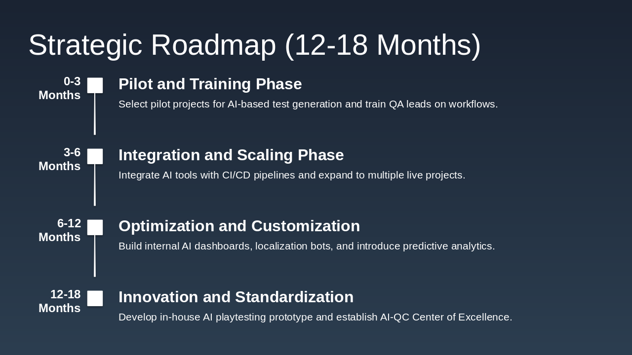 Phase 4 (12–18 Months): Innovation and Standardization - Develop in-house AI playtesting prototype. - Establish AI-QC Center of Excellence for cross-project best practices.