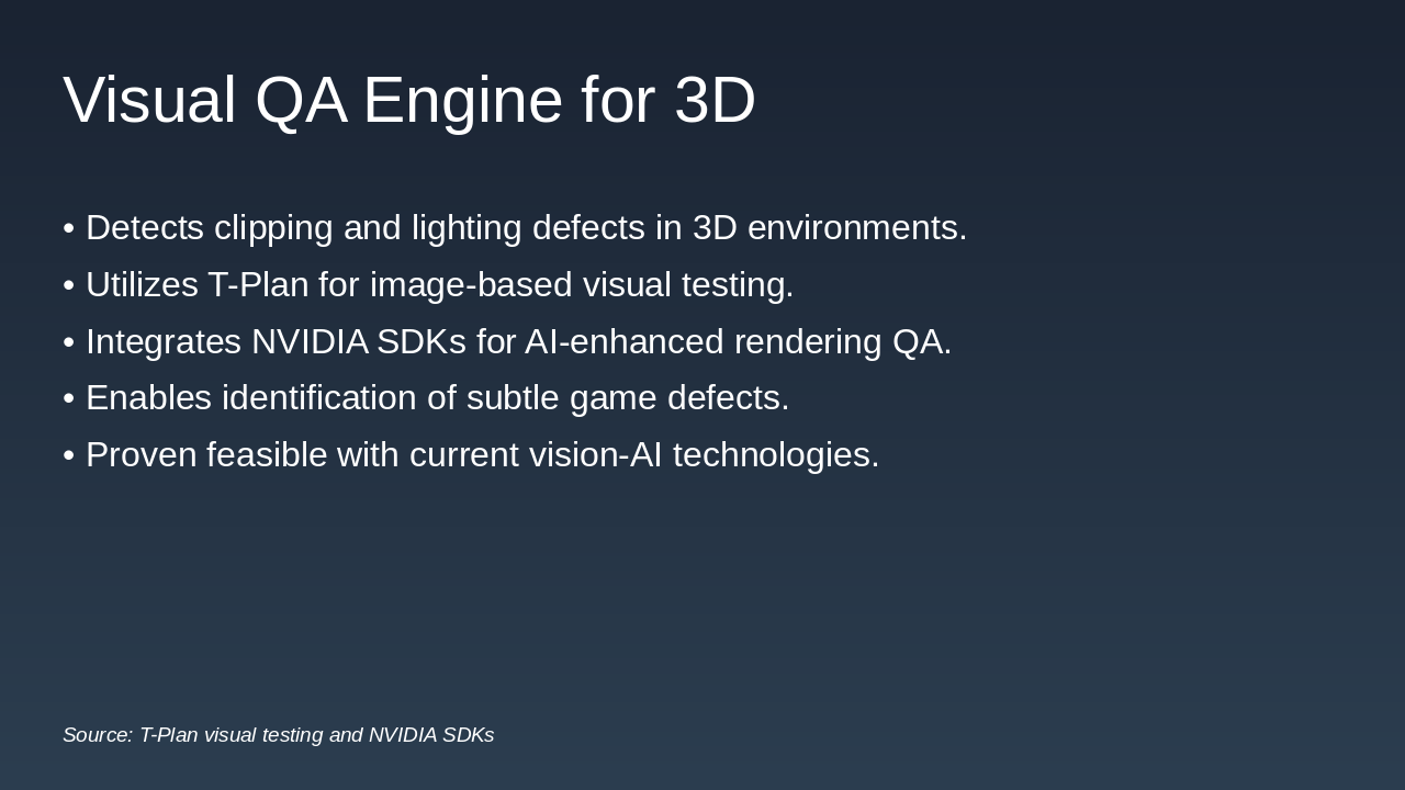 Visual QA Engine for 3D T-Plan visual testing, NVIDIA tools Deep vision for 3D game scenes (lighting/clipping) is less mature opportunity to lead.