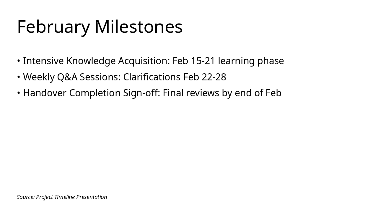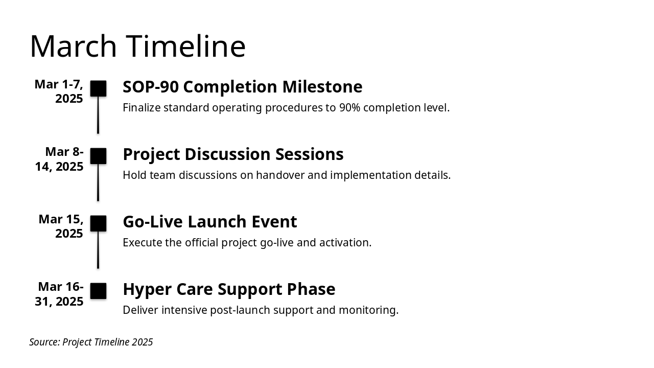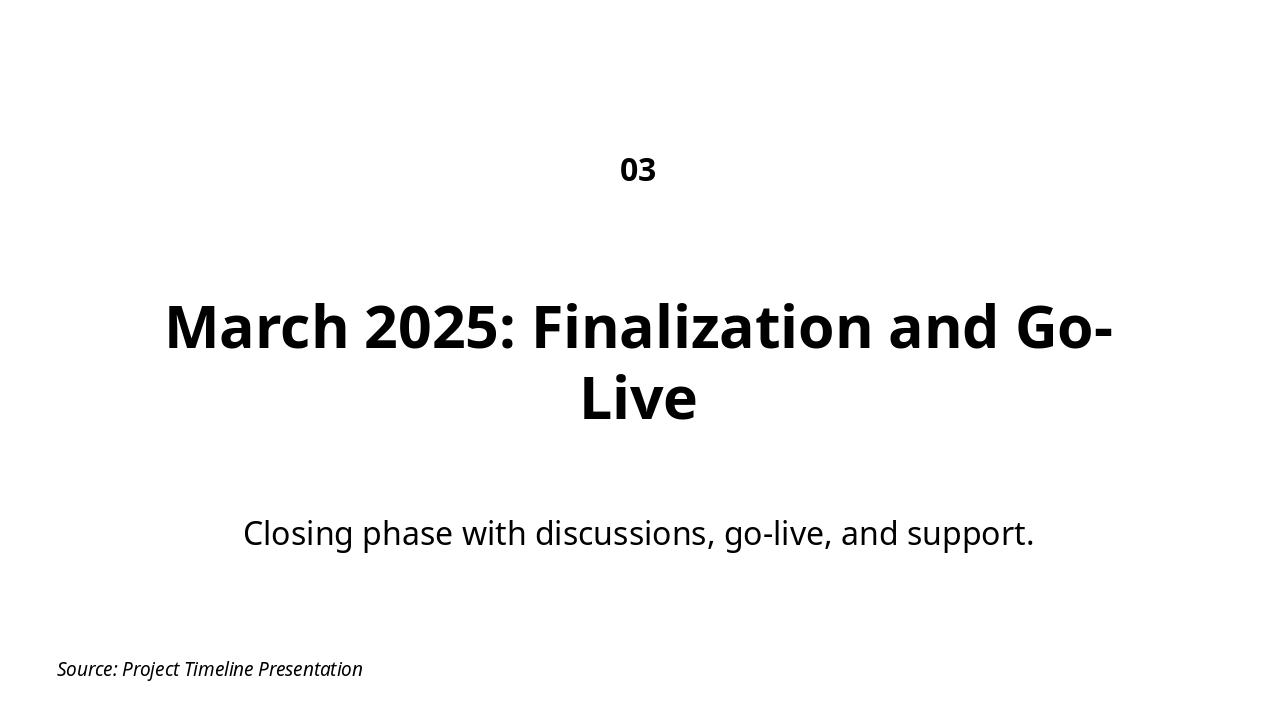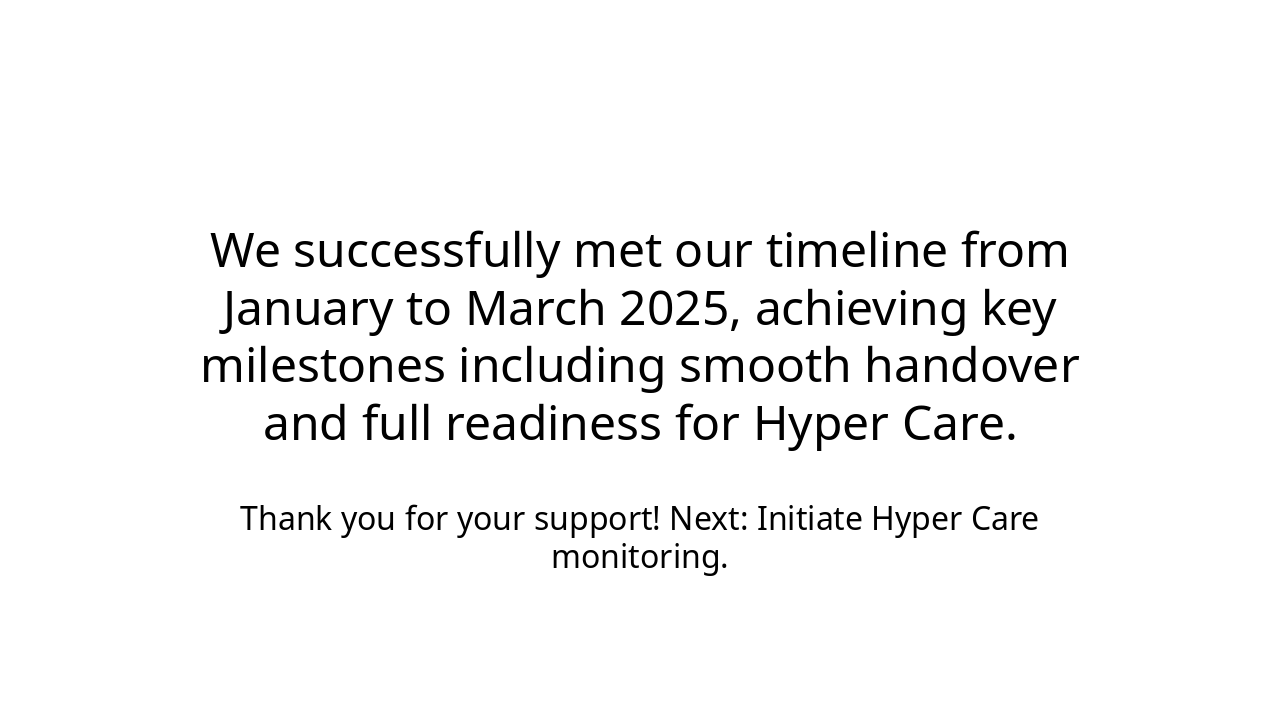 Summary of achievements and outline for post-project support. Source: Project timeline presentation from January to March 2025, covering milestones from Holiday to Hyper Care.