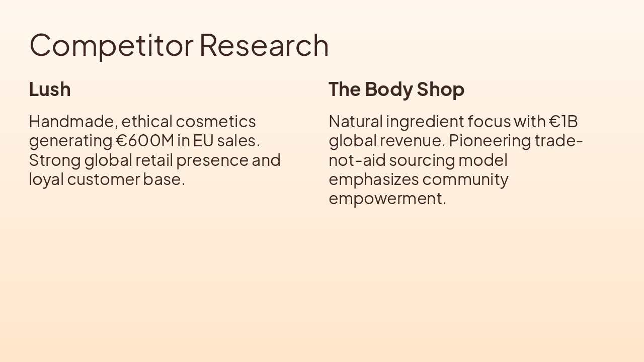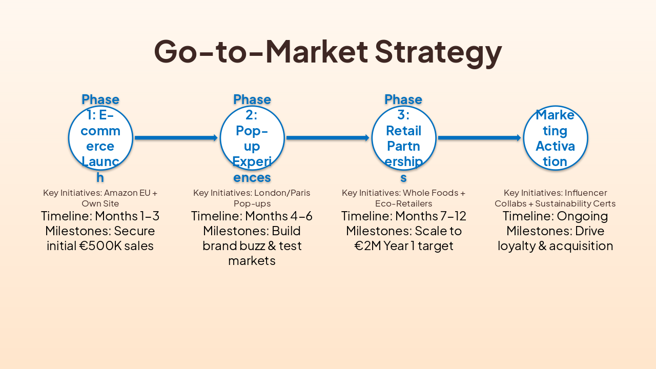 The go-to-market strategy features three phases: E-commerce launch on Amazon EU and own site (months 1-3, €500K sales), pop-up experiences in London/Paris (months 4-6, build buzz), and retail partnerships with Whole Foods/eco-retailers (months 7-12, €2M Year 1 target). Ongoing marketing includes influencer collabs and sustainability certs to drive loyalty and acquisition.