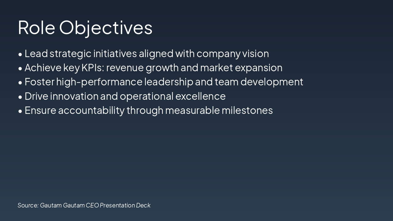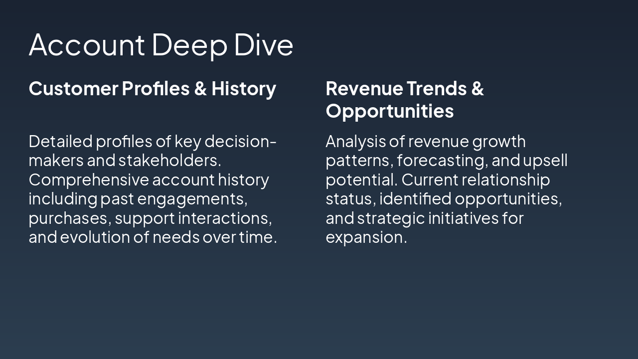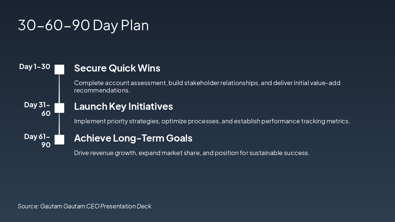 Day 1-30: Secure Quick Wins Complete account assessment, build stakeholder relationships, and deliver initial value-add recommendations. Day 31-60: Launch Key Initiatives Implement priority strategies, optimize processes, and establish performance tracking metrics. Day 61-90: Achieve Long-Term Goals Drive revenue growth, expand market share, and position for sustainable success.