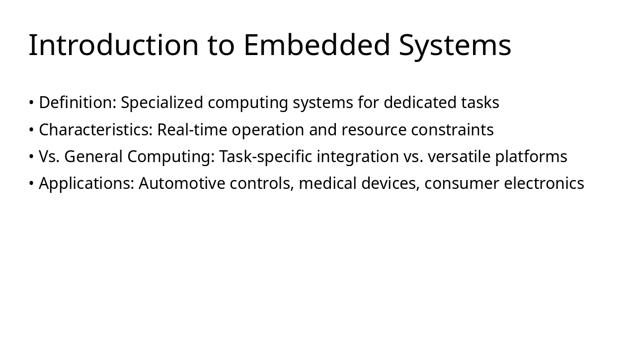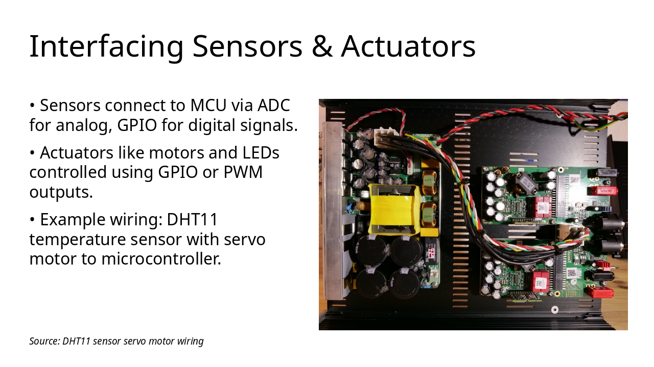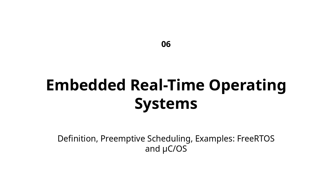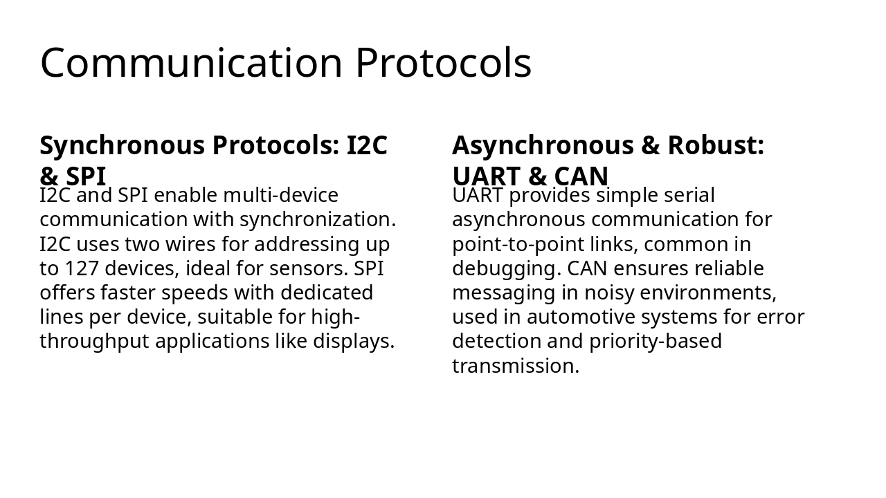 RTOS, sensors/actuators, and communication protocols like I2C, SPI, UART, CAN.