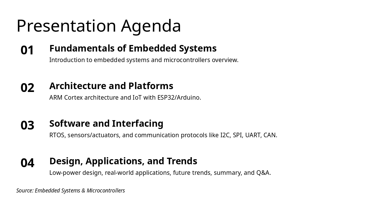 The presentation agenda outlines the fundamentals of embedded systems, including an introduction to embedded systems and microcontrollers. It covers architecture and platforms like ARM Cortex and IoT with ESP32/Arduino, software and interfacing with RTOS, sensors, actuators, and protocols such as I2C, SPI, UART, and CAN, followed by design, applications, trends, summary, and Q&A.