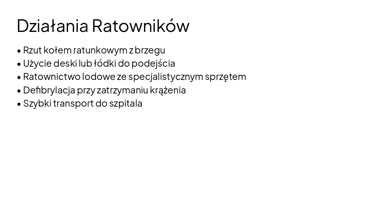 { "headers": [ "Etap", "Działanie", "Uwagi" ], "rows": [ [ "1. Wyciągnij z wody", "Natychmiast wyciągnij poszkodowanego z wody na brzeg.", "Priorytet: bezpieczeństwo ratownika!" ], [ "2. Sprawdź oddech", "Sprawdź oddech i krążenie (max. 10 s).", "Jeśli brak - przejdź do resuscytacji." ], [ "3. Masaż serca + oddechy", "Rozpocznij RKO: 30 uciśnięć : 2 wdechy.", "Kontynuuj do przybycia pomocy." ], [ "4. Rozgrzej (nie gorąco!)", "Owiń kocem termicznym, ogrzewaj stopniowo.", "Nigdy nie stosuj gorąca!" ], [ "5. Wezwij pomoc 112", "Zadzwoń pod 112, podaj szczegóły.", "Zostań z poszkodowanym." ] ] }