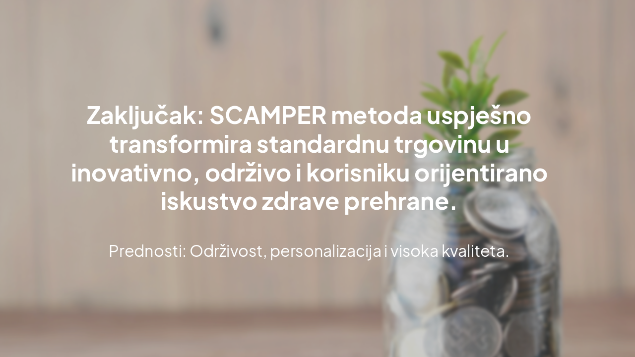 Zaključak: SCAMPER metoda uspješno transformira standardnu trgovinu u inovativno, održivo i korisniku orijentirano iskustvo zdrave prehrane.