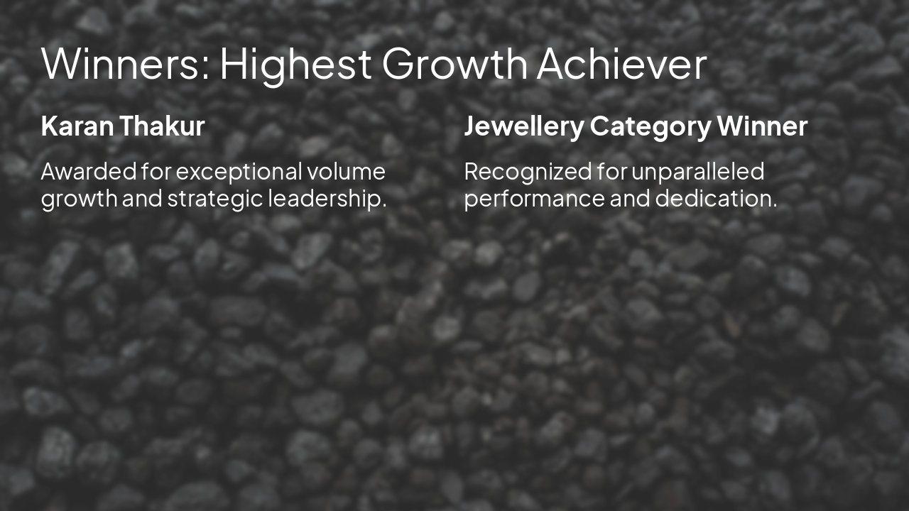 Redesign the uploaded presentation 'Rank Awards Presentation' into a premium, high-end corporate awards deck. Style direction: - Theme: Black, gold, and deep charcoal luxury palette - Typography: Modern sans-serif (Montserrat / Playfair Display mix) - Visuals: Minimal, cinematic, spotlight lighting, subtle gradients, glassmorphism cards - Animations: Smooth fade + zoom, elegant reveal for winners Structure: 1. Cover Slide: “Rank Awards Night” with subtitle “Celebrating Our Champions” 2. Opening Slide: Emotional message about people over numbers 3. Section Divider: “Best Achiever Award – Inverness” 4. Winner Slide (1st place): Pankaj Gupta (large spotlight layout) 5. Winner Slide (2nd place): Prem Agarwal 6. Quote Slide: “Some people follow leads…” styled elegantly 7. Section Divider: “New Business Champion” 8. Winner Slides: Prem Agarwal, Narendra Relekar 9. Section Divider: “Highest Growth Achiever” 10. Winner Slides: Karan Thakur, Jewellery category winner 11. Section Divider: “Gold Performer Award” 12. Winner Slides: Pankaj Gupta, Subhakanta Das 13. Grand Finale Slide: “Highest Overall Revenue” – Prashant Gupta (hero slide with dramatic gold highlight) 14. Closing Slide: “At Rank, we don’t chase success… We define it.” Enhancements: - Use iconography (trophy, sparkles, spotlight) - Add subtle gold particle backgrounds - Consistent spacing, alignment, and visual hierarchy - Keep text minimal and impactful Output should be a polished, visually stunning premium presentation suitable for a corporate awards ceremony.