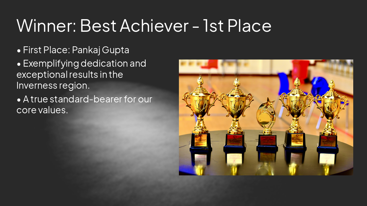 Prestigious awards ceremony honoring top performers at Rank. Highlights include Best Achiever in Inverness (Pankaj Gupta, Prem Agarwal), New Business Champions (Prem Agarwal, Narendra Relekar), Highest Growth Achiever (Karan Thakur), Gold Performers,