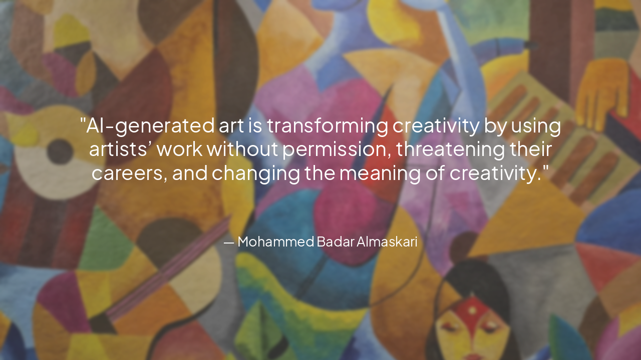 > AI-generated art is transforming creativity by using artists’ work without permission, threatening their careers, and changing the meaning of creativity.