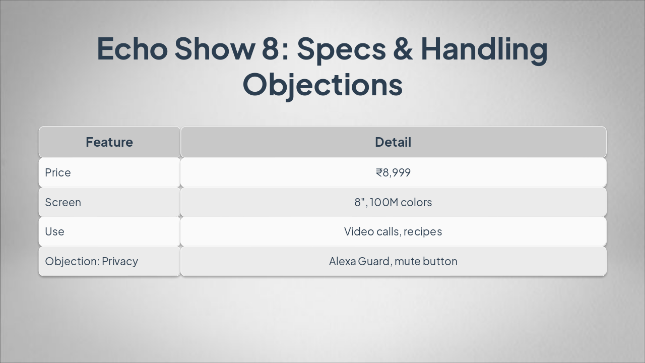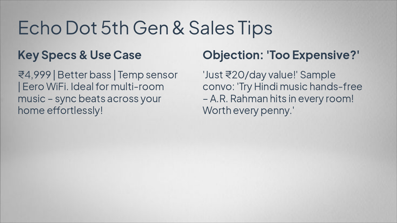 { "features": [ { "icon": "📺", "heading": "Compact 4\" Display", "description": "Echo Spot's vibrant screen for time, weather, alarms." }, { "icon": "💰", "heading": "Spot: ₹4,999 Price", "description": "Affordable bedside alarm clock with Alexa smarts." }, { "icon": "🎨", "heading": "Colorful Pop Design", "description": "Echo Pop mini speaker in fun, vibrant colors." }, { "icon": "💸", "heading": "Pop: ₹3,999 Value", "description": "Compact audio companion at unbeatable price point." }, { "icon": "⏰", "heading": "Kitchen Timers", "description": "Hands-free reminders perfect for cooking routines." }, { "icon": "🛏️", "heading": "Bedside Assistant", "description": "Wake up with music, routines on nightstand." } ] }