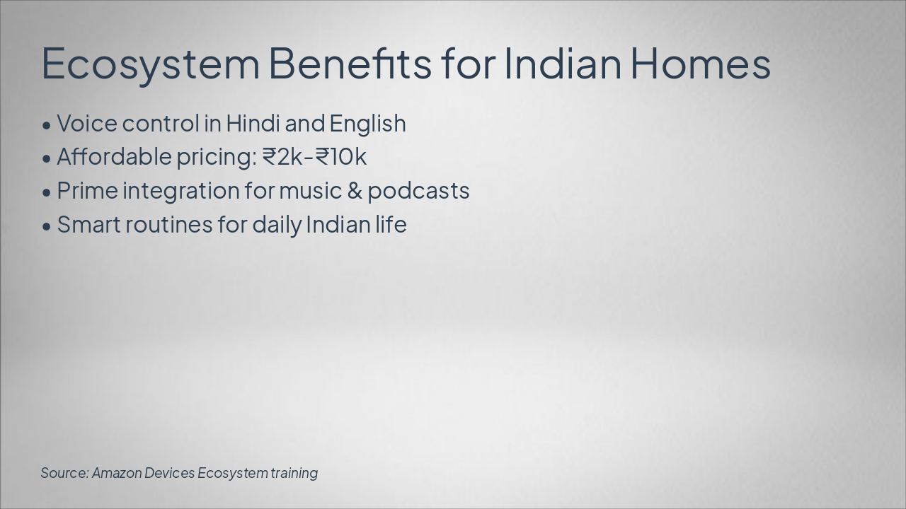 The Echo Spot & Pop slide highlights key specs: Echo Spot's compact 4" display, ₹4,999 price as an Alexa-enabled bedside alarm clock, and Echo Pop's colorful design at ₹3,999 as a mini speaker. Additional features include hands-free kitchen timers and bedside assistance for music and routines.