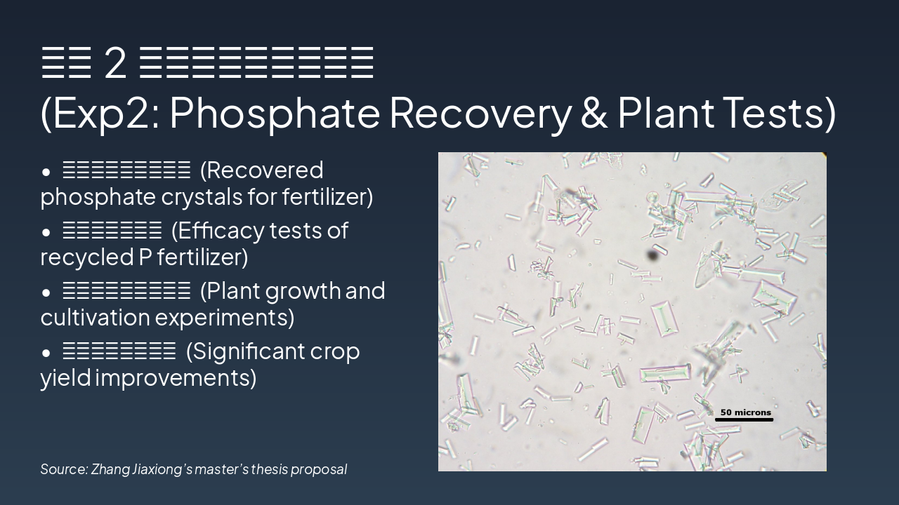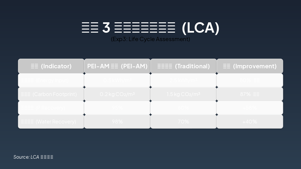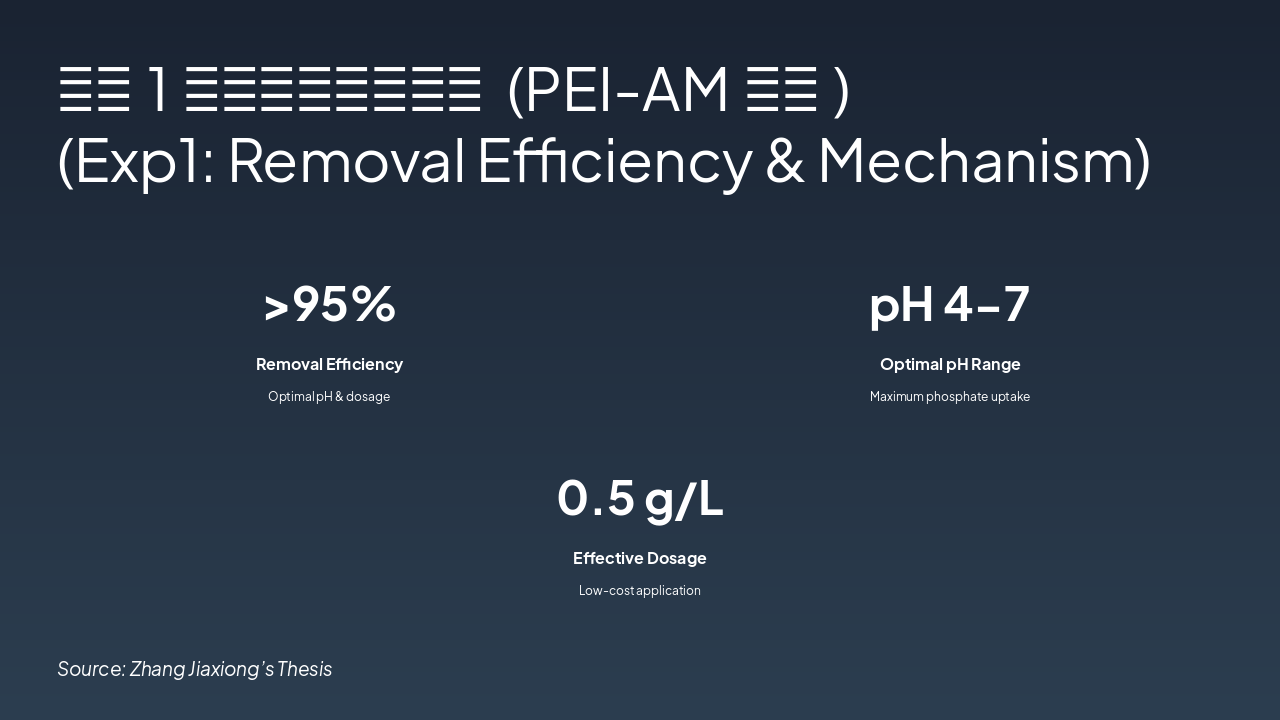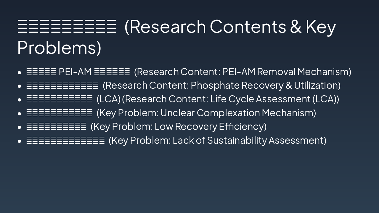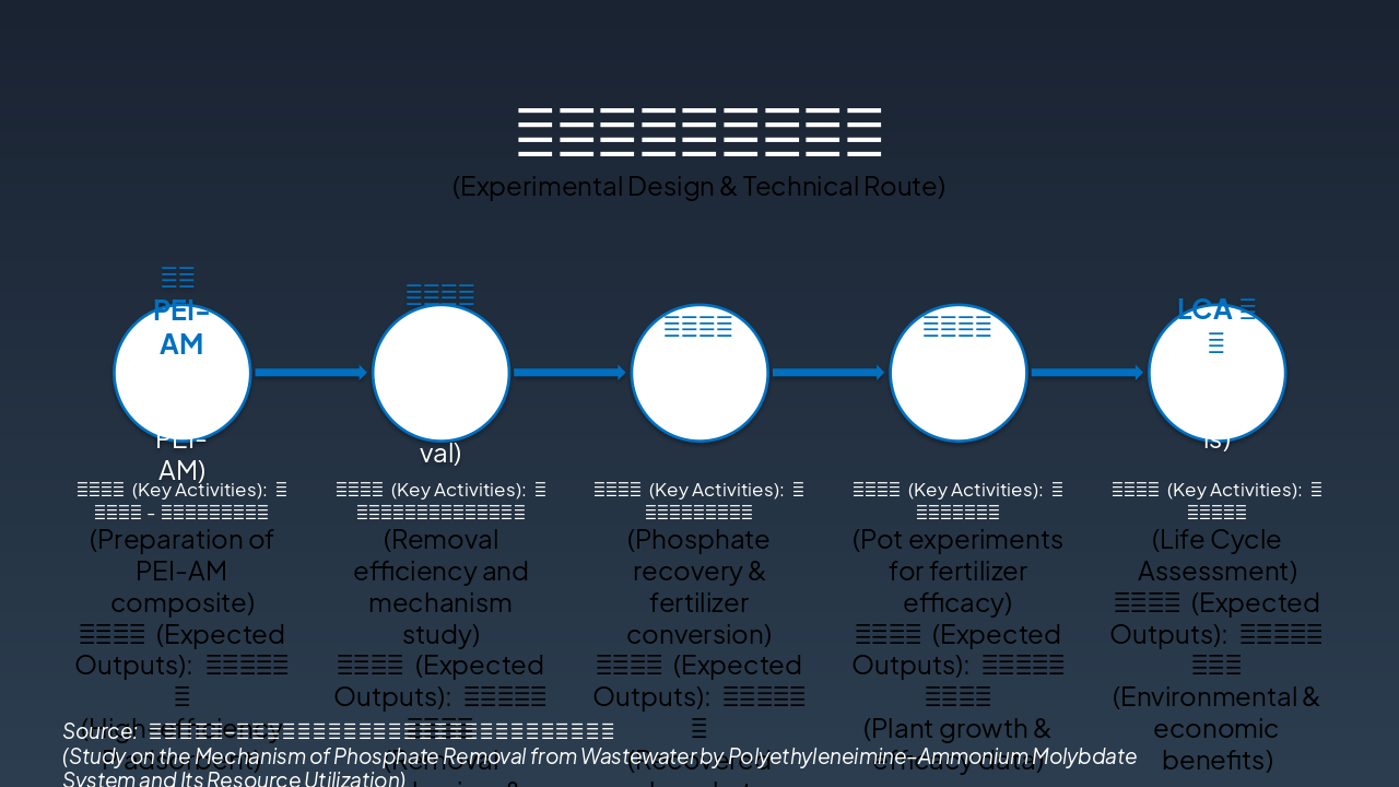 { "features": [ { "icon": "🧪", "heading": "新型PEI-AM络合剂 Novel PEI-AM Agent", "description": "开发高效络合剂去除废水中磷酸盐,实现精准捕获。 Developed for efficient phosphate removal from wastewater." }, { "icon": "🌱", "heading": "资源化肥料制备 Resource Fertilizer", "description": "回收磷酸盐转化为可持续肥料,经植物栽培验证。 Recovered phosphate into sustainable fertilizer, validated by plant tests." }, { "icon": "📊", "heading": "LCA生命周期模型 LCA Model", "description": "评估体系全生命周期环境影响与可持续性。 Assesses full life cycle environmental impact and sustainability." }, { "icon": "📄", "heading": "高水平学术论文 High-Impact Papers", "description": "计划发表多篇SCI论文,推广研究成果。 Planned SCI publications to disseminate key findings." }, { "icon": "📜", "heading": "发明专利申请 Invention Patents", "description": "申请络合剂与资源化利用方法的专利保护。 Patents for complex agent and resource utilization methods." }, { "icon": "♻️", "heading": "绿色技术推广 Green Tech Promotion", "description": "推动磷回收循环经济,助力环境保护。 Advances circular economy for phosphorus recovery and eco-protection." } ] }