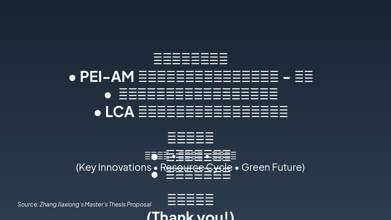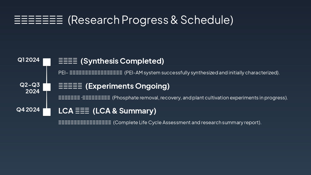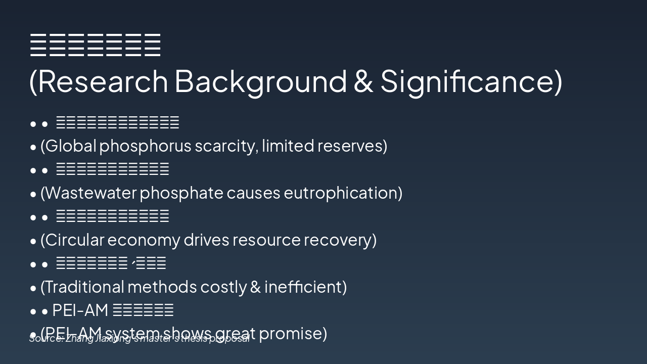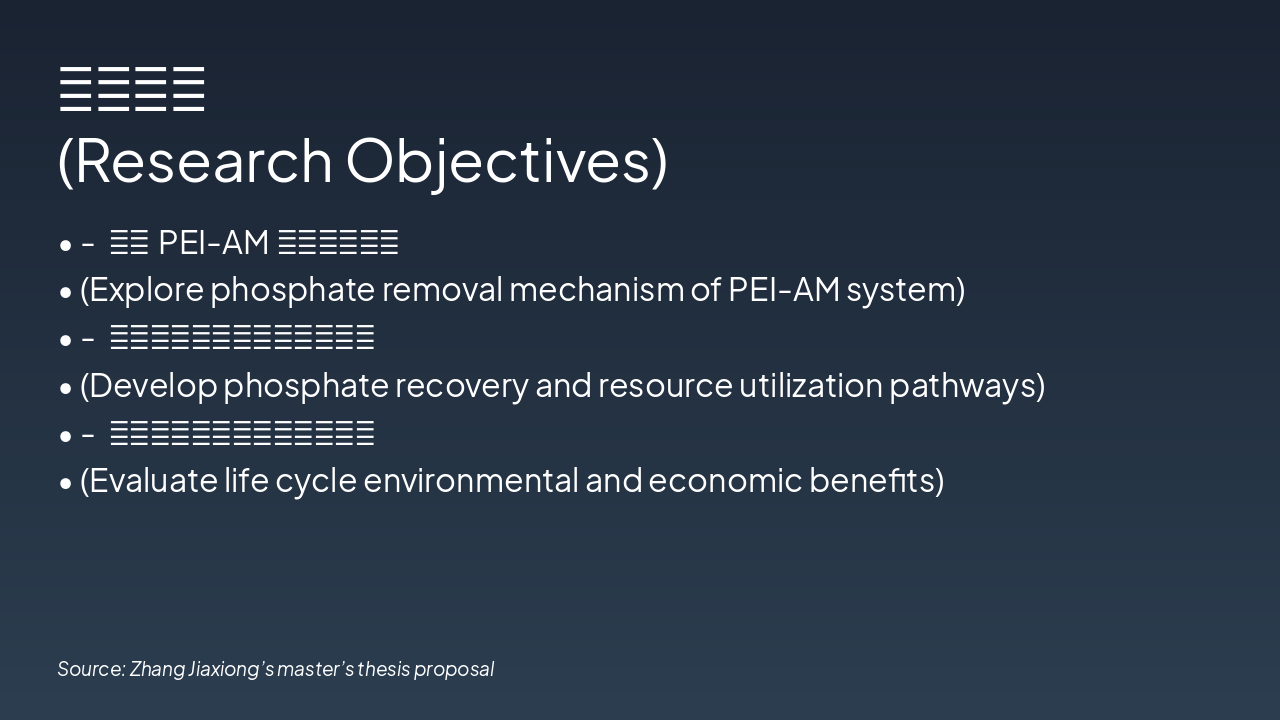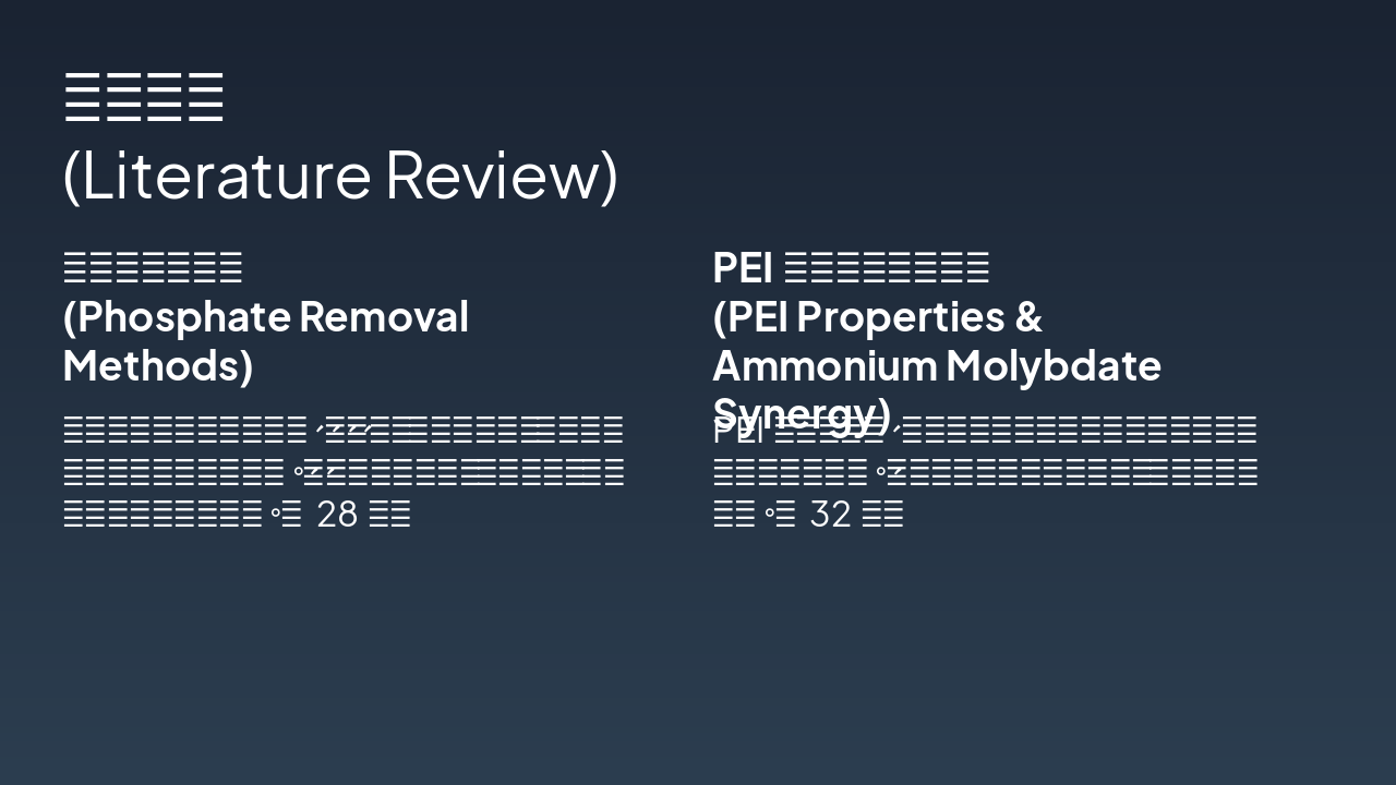 { "features": [ { "icon": "🧪", "heading": "新型PEI-AM络合剂 Novel PEI-AM Agent", "description": "开发高效络合剂去除废水中磷酸盐,实现精准捕获。 Developed for efficient phosphate removal from wastewater." }, { "icon": "🌱", "heading": "资源化肥料制备 Resource Fertilizer", "description": "回收磷酸盐转化为可持续肥料,经植物栽培验证。 Recovered phosphate into sustainable fertilizer, validated by plant tests." }, { "icon": "📊", "heading": "LCA生命周期模型 LCA Model", "description": "评估体系全生命周期环境影响与可持续性。 Assesses full life cycle environmental impact and sustainability." }, { "icon": "📄", "heading": "高水平学术论文 High-Impact Papers", "description": "计划发表多篇SCI论文,推广研究成果。 Planned SCI publications to disseminate key findings." }, { "icon": "📜", "heading": "发明专利申请 Invention Patents", "description": "申请络合剂与资源化利用方法的专利保护。 Patents for complex agent and resource utilization methods." }, { "icon": "♻️", "heading": "绿色技术推广 Green Tech Promotion", "description": "推动磷回收循环经济,助力环境保护。 Advances circular economy for phosphorus recovery and eco-protection." } ] }