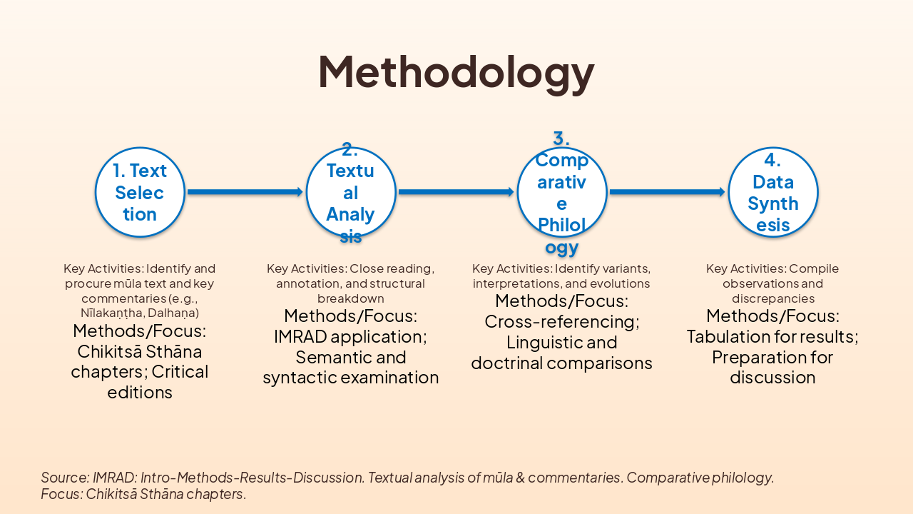 Source: IMRAD: Intro-Methods-Results-Discussion. Textual analysis of mūla & commentaries. Comparative philology. Focus: Chikitsā Sthāna chapters.