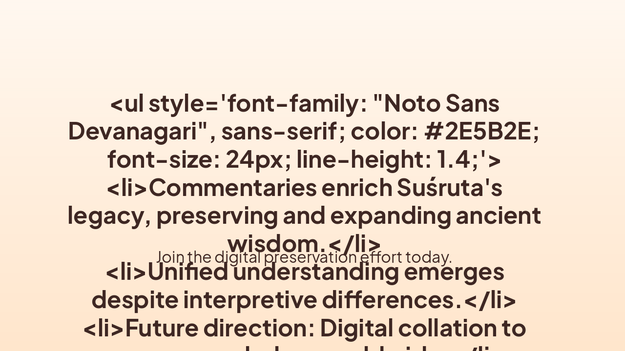 { "headers": [ "Phase", "Key Activities", "Methods/Focus" ], "rows": [ [ "1. Text Selection", "Identify and procure mūla text and key commentaries (e.g., Nīlakaṇṭha, Dalhaṇa)", "Chikitsā Sthāna chapters; Critical editions" ], [ "2. Textual Analysis", "Close reading, annotation, and structural breakdown", "IMRAD application; Semantic and syntactic examination" ], [ "3. Comparative Philology", "Identify variants, interpretations, and evolutions", "Cross-referencing; Linguistic and doctrinal comparisons" ], [ "4. Data Synthesis", "Compile observations and discrepancies", "Tabulation for results; Preparation for discussion" ] ] }