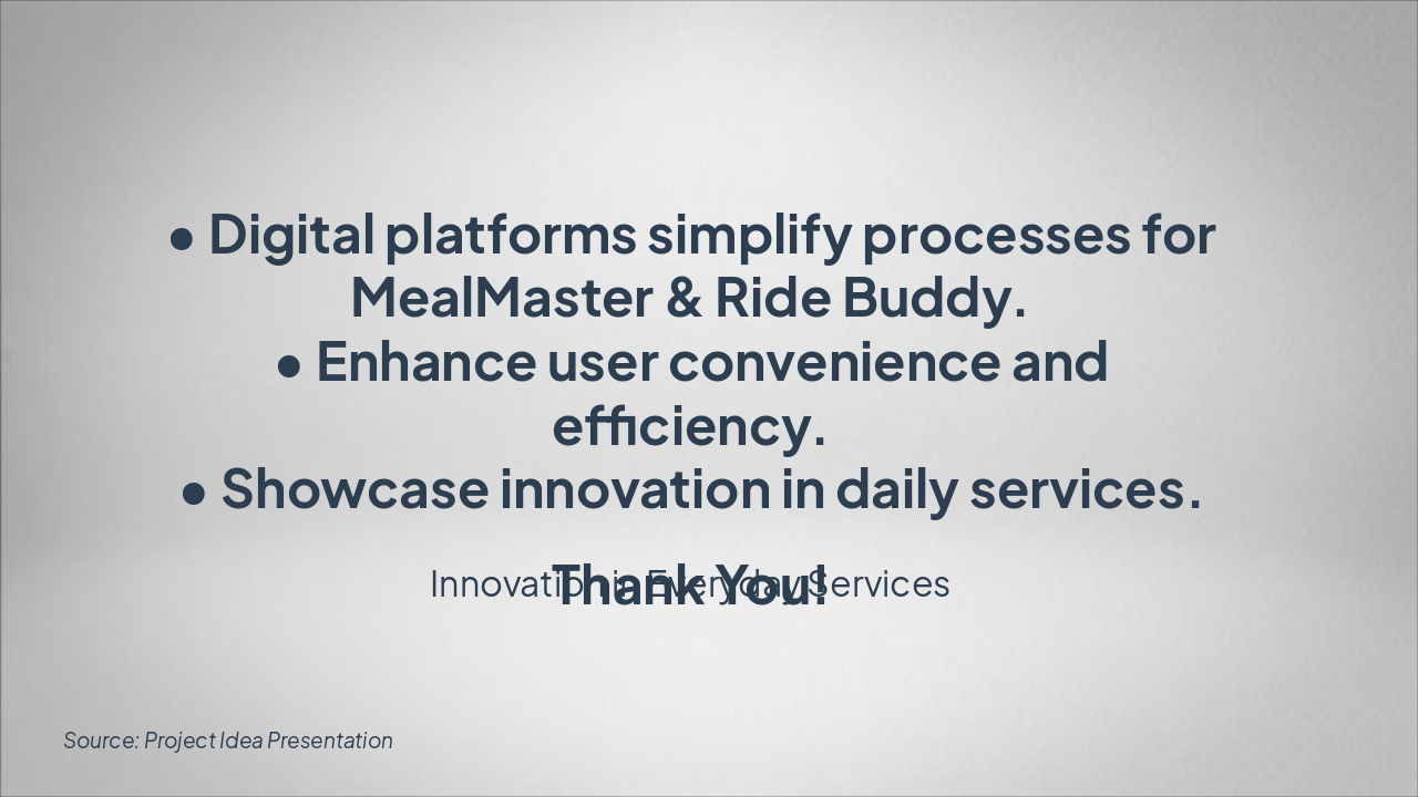 Digital platforms simplify processes for MealMaster and Ride Buddy, enhancing user convenience, efficiency, and innovation in daily services. The slide, subtitled "Innovation in Everyday Services," concludes with "Thank You!"