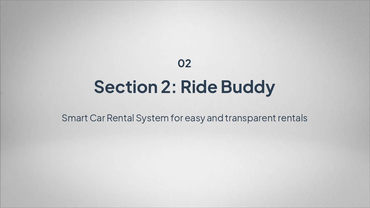 This section header slide introduces Section 02: Ride Buddy. Its subtitle describes it as a Smart Car Rental System for easy and transparent rentals.