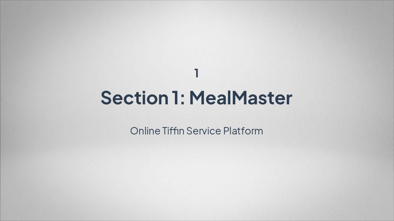 This slide serves as the section header for Section 1, titled "MealMaster." The subtitle describes it as an "Online Tiffin Service Platform."
