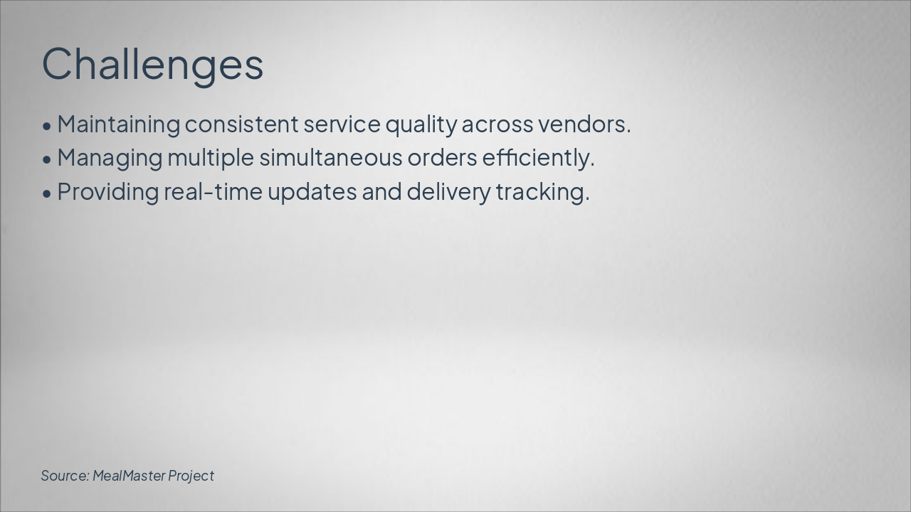 The "Challenges" slide highlights key issues in service operations. It lists maintaining consistent quality across vendors, managing multiple simultaneous orders efficiently, and providing real-time updates with delivery tracking.