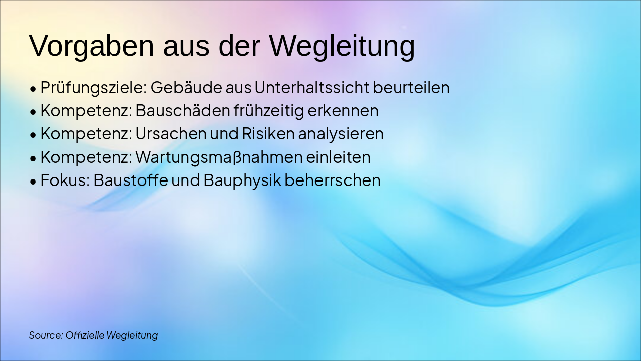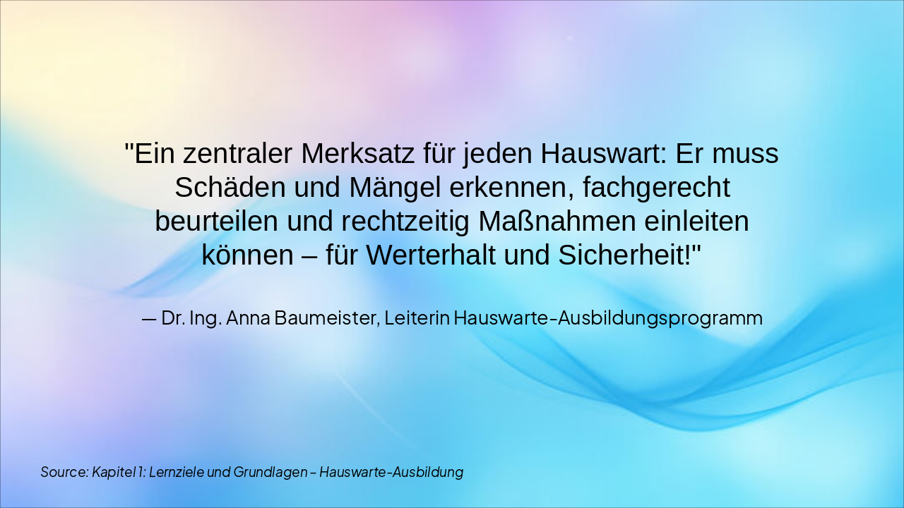 Der Slide „Merksatz“ präsentiert ein zentrales Prinzip für Hauswarte von Dr. Ing. Anna Baumeister. Es fordert, Schäden und Mängel zu erkennen, fachgerecht zu bewerten und rechtzeitig Maßnahmen einzuleiten – für Werterhalt und Sicherheit.