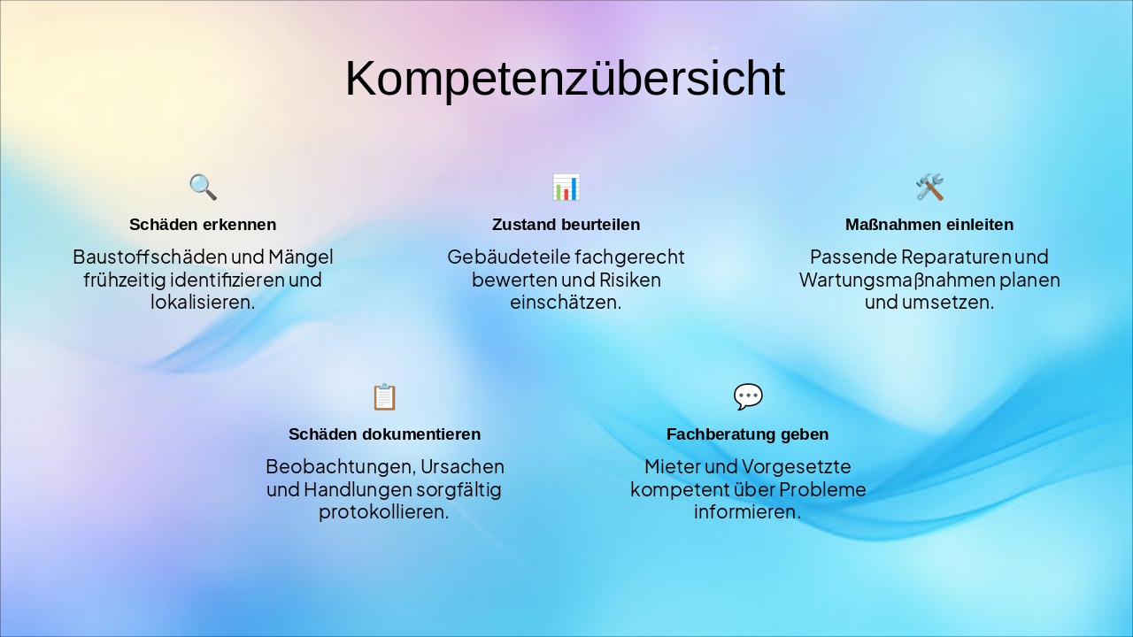 > Ein zentraler Merksatz für jeden Hauswart: Er muss Schäden und Mängel erkennen, fachgerecht beurteilen und rechtzeitig Maßnahmen einleiten können – für Werterhalt und Sicherheit!