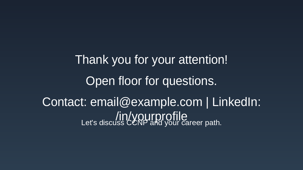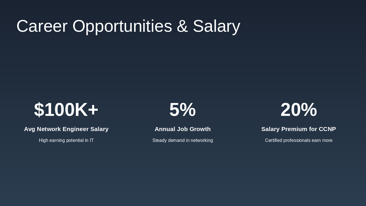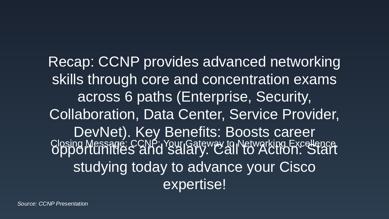 Opportunities, salaries, who should pursue it, summary, and Q&A session. Source: CCNP Overview Presentation