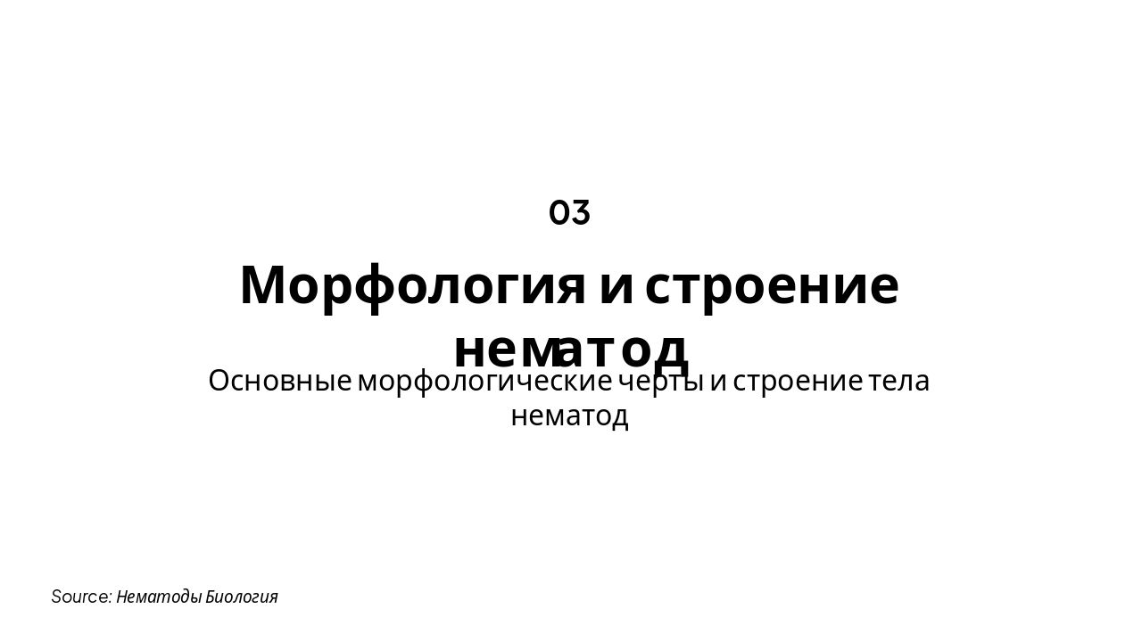 Этот слайд представляет раздел 03 под названием "Морфология и строение нематод". Он содержит подзаголовок "Основные морфологические черты и строение тела нематод", вводящий тему морфологии и анатомии нематод.
