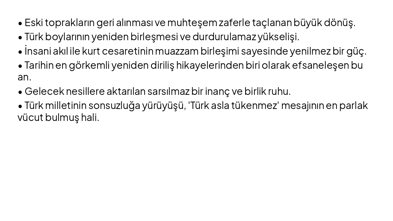 Umudun ve direnişin en yüce ifadesi Türk milletinin sarsılmaz varoluş iradesi Her sonun bir başlangıç olduğunun mesajı Özgürlüğün ve bağımsızlığın ebedi sembolü Gelecek nesillere ilham veren kadim bir miras Milli ruhu daima diri tutan ölümsüz bir destan