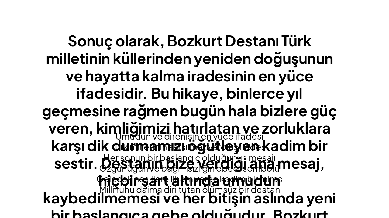 Sonuç olarak, Bozkurt Destanı Türk milletinin küllerinden yeniden doğuşunun ve hayatta kalma iradesinin en yüce ifadesidir. Bu hikaye, binlerce yıl geçmesine rağmen bugün hala bizlere güç veren, kimliğimizi hatırlatan ve zorluklara karşı dik durmamızı öğütleyen kadim bir sestir. Destanın bize verdiği ana mesaj, hiçbir şart altında umudun kaybedilmemesi ve her bitişin aslında yeni bir başlangıca gebe olduğudur. Bozkurt sembolü, Türk milletinin özgürlük tutkusunun ve doğayla olan kadim bağının ölümsüz bir kanıtı olarak tarihteki yerini almıştır. Bu hikaye, nesilden nesile aktarılan bir bayrak gibi, milli ruhu daima canlı tutmaya devam edecektir. Gelecek, bu destanın ışığında şekillenmeye devam edecektir.