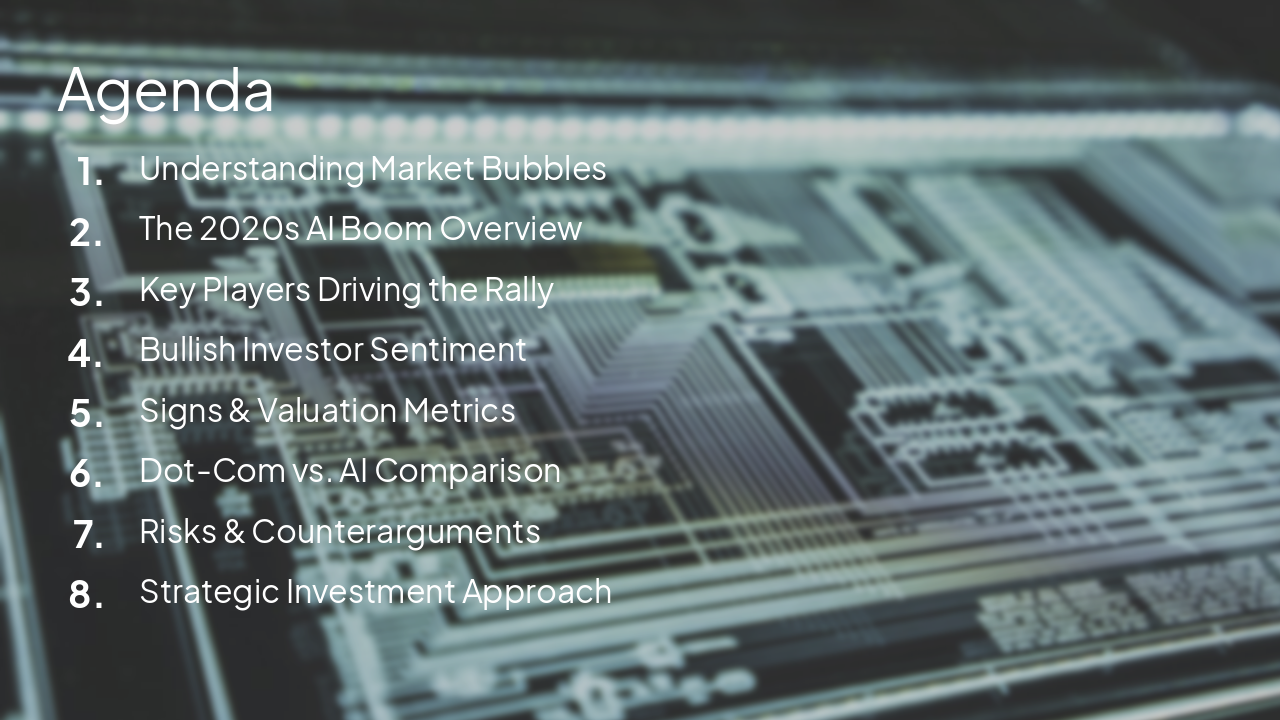 Create a professional PowerPoint presentation on the topic "The AI Stock Market Bubble". Include ~12-15 slides with clear structure: 1. Title Slide: The AI Stock Market Bubble (subtitle: hype vs reality) 2. Agenda 3. What is a Stock Market Bubble? (definition + examples like dot-com) 4. Overview of AI Boom (2020s surge, key drivers) 5. Key Companies Leading AI Rally (NVIDIA, Microsoft, Google, etc.) 6. Why Investors are Bullish on AI (growth potential, productivity gains) 7. Signs of a Bubble (overvaluation, hype cycles, speculation) 8. Valuation Metrics (P/E ratios, comparisons) 9. Comparison to Dot-Com Bubble (similarities & differences) 10. Risks and Concerns (regulation, overhype, profitability) 11. Counterarguments: Why This Might NOT Be a Bubble 12. Expert Opinions / Market Sentiment 13. Possible Scenarios (bubble burst vs sustained growth) 14. Investment Strategies (diversification, risk management) 15. Conclusion & Key Takeaways Style: modern, clean, tech-themed visuals (blue/purple gradients), minimal text per slide, include icons and charts suggestions. Tone: informative and balanced. Add speaker notes for each slide.