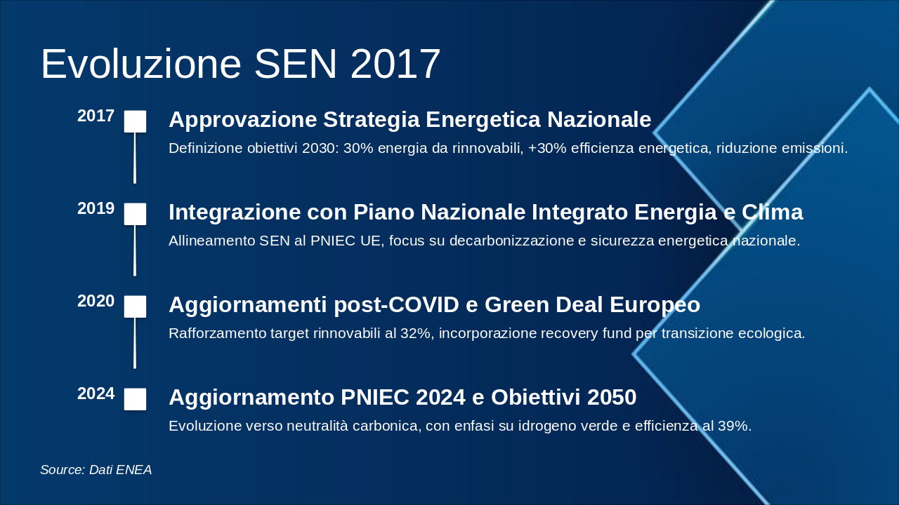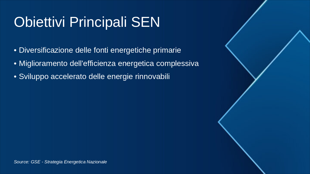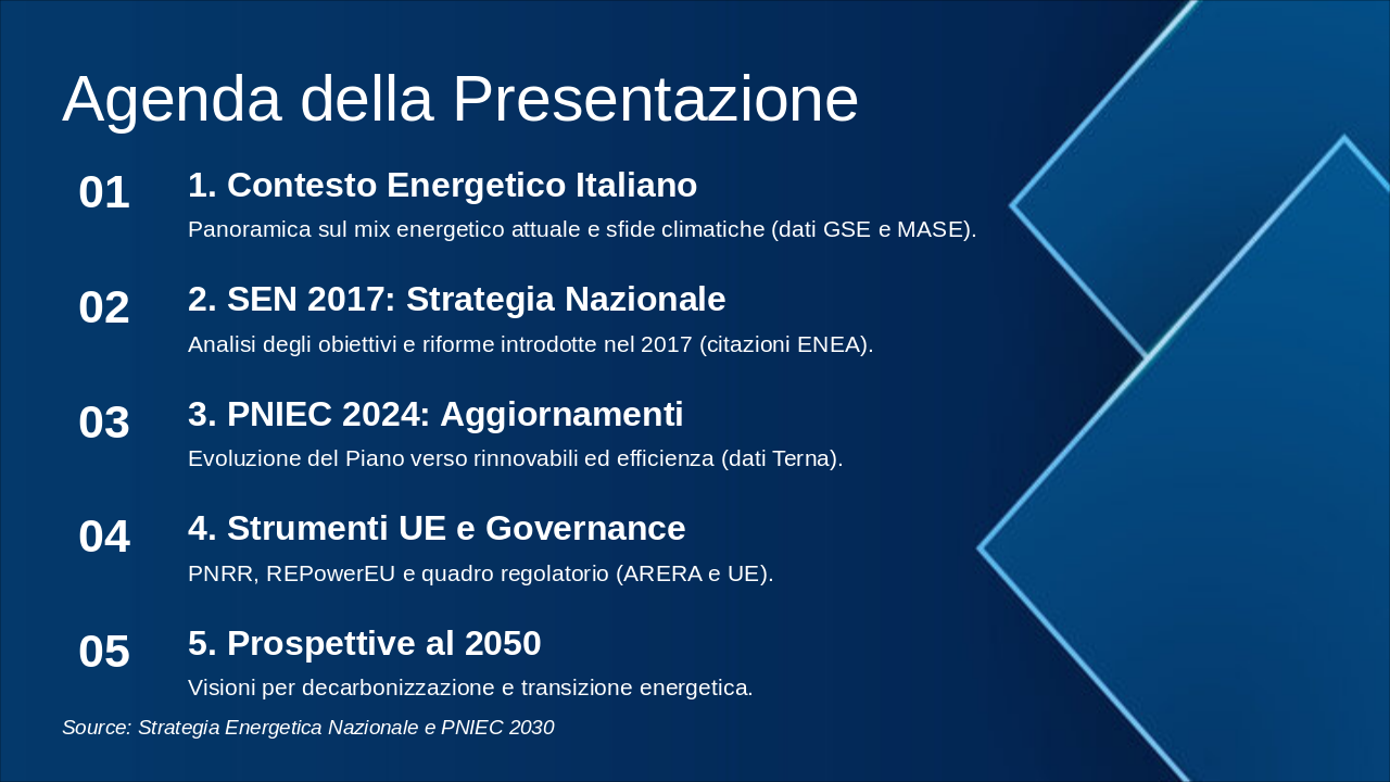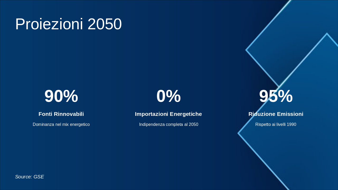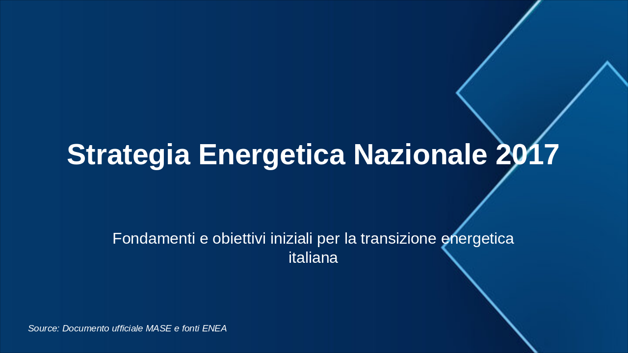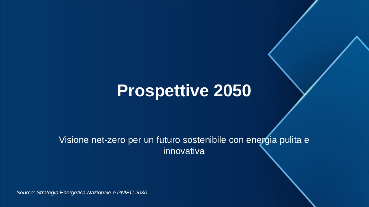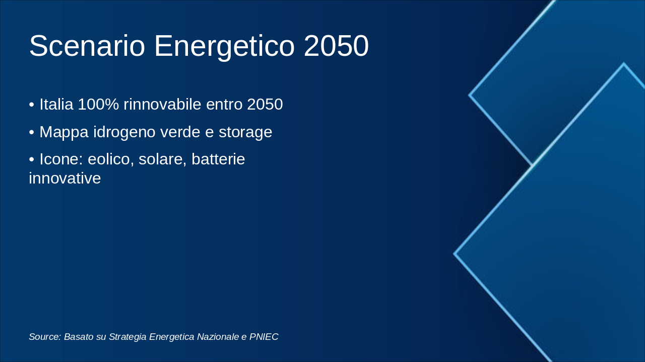 Questa slide illustra la roadmap energetica italiana verso il 2050, con milestones chiave per decarbonizzazione. Enfatizzare il grafico progressivo del mix energetico e riduzione emissioni. Usare icone rinnovabili (sole, vento) e barre per obiettivi. Contestualizzare con SEN e PNIEC: 2030 focus su rinnovabili 30%, efficienza; 2040 intermedi verso neutralità; 2050 zero emissioni nette. Citare MASE per dati ufficiali. Durata discussione: 5-7 min.